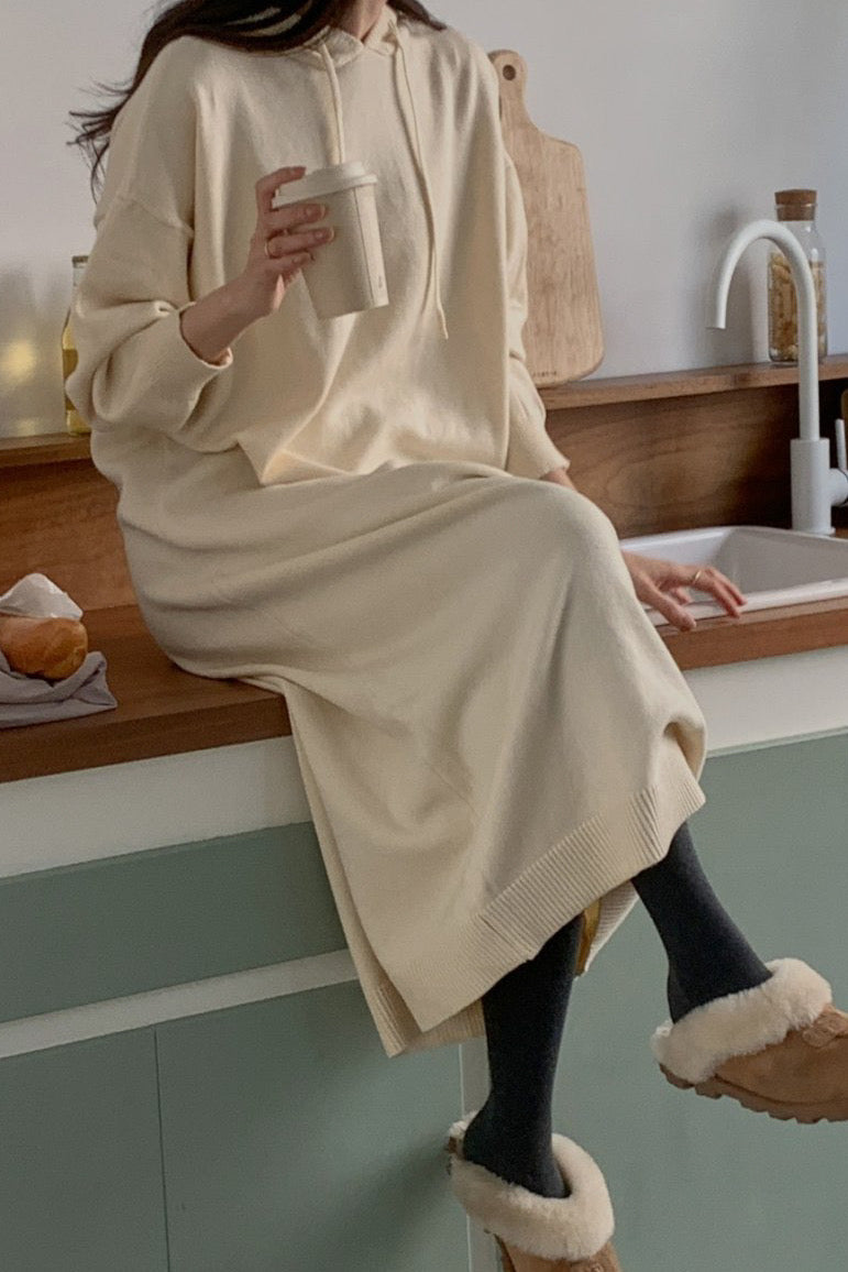 The Soft Knit Hoodie Dress combines cozy comfort with an effortlessly chic silhouette. Crafted from a soft, medium-weight knit, it drapes beautifully while keeping you warm through the cooler seasons. The relaxed fit and ribbed cuffs add structure, while the hood and drawstring detail lend a laid-back, modern touch. Its ankle-length design elongates the figure and pairs perfectly with boots or slip-ons for an easy, polished look. Ideal for casual days or cozy weekends, this dress delivers timeless comfort with refined simplicity.