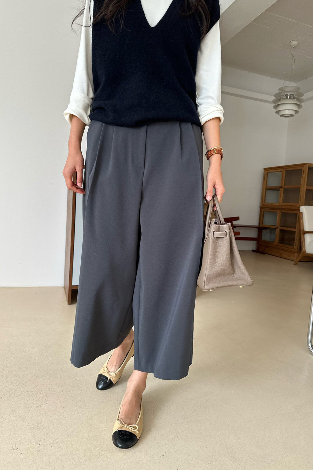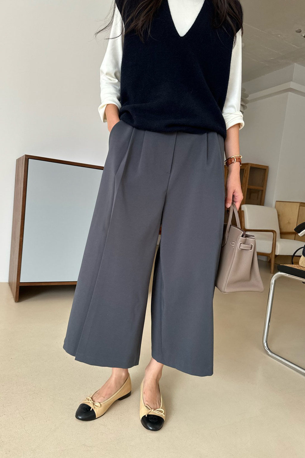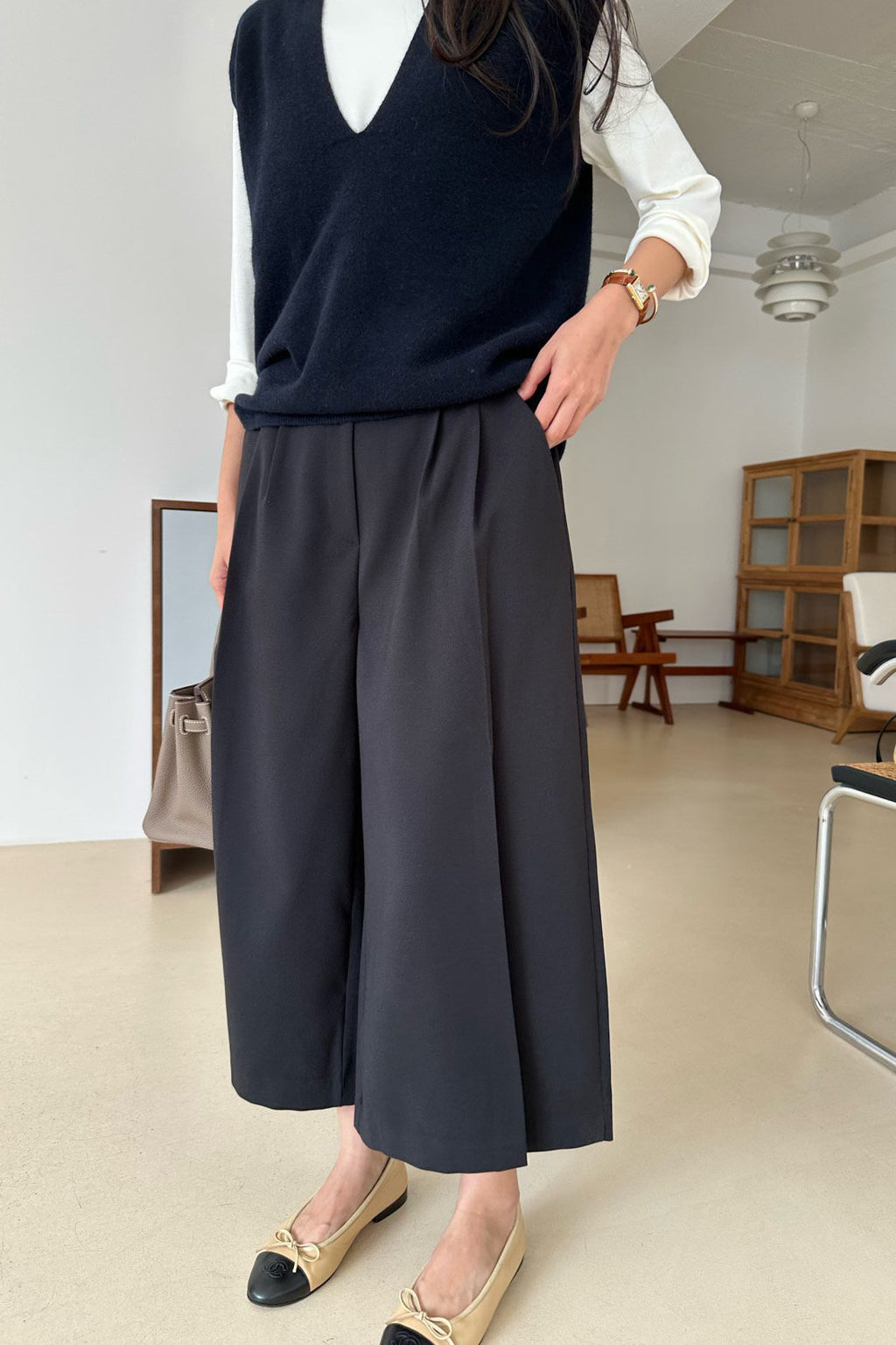 Chic wide-leg slacks featuring front tuck details for a polished silhouette. The cropped length elegantly highlights the ankle, making them perfect to pair with flats, socks, or stockings in the cooler seasons. Designed with a banded waist for comfort and a front zip closure for easy wear, these slacks blend sophistication with everyday practicality.