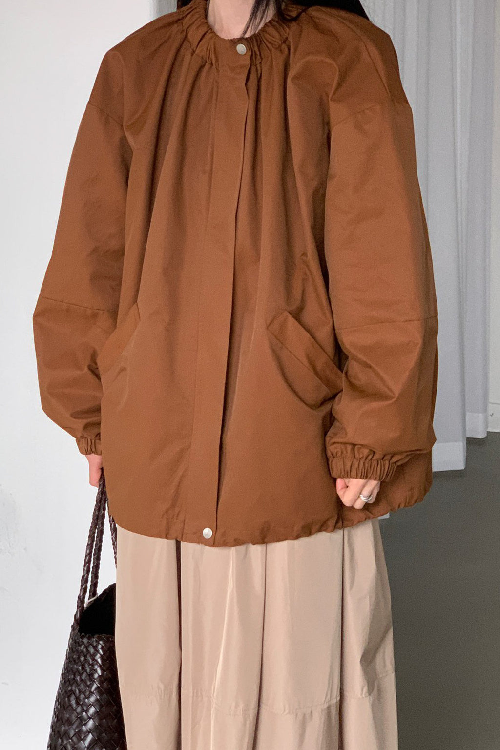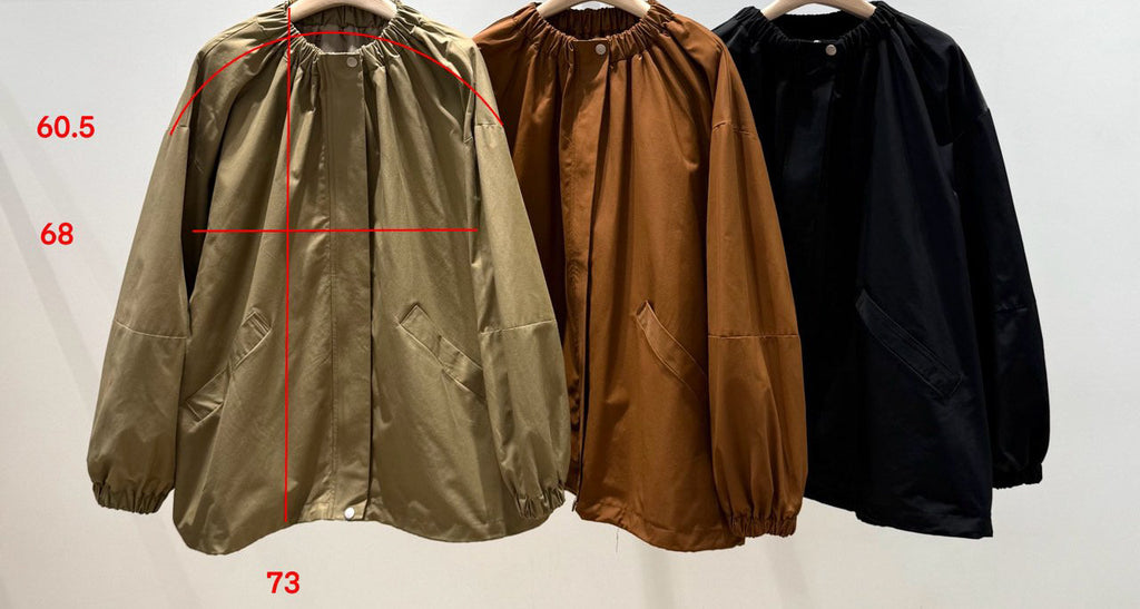 This oversized zip-up jacket blends clean minimalism with soft volume, thanks to its collarless neckline and gathered shirring detail. Lightweight yet cozy, it features elasticated cuffs, roomy pockets, and an adjustable hem for added comfort and shape. A perfect outer layer for transitional weather that adds quiet sophistication to any casual look.