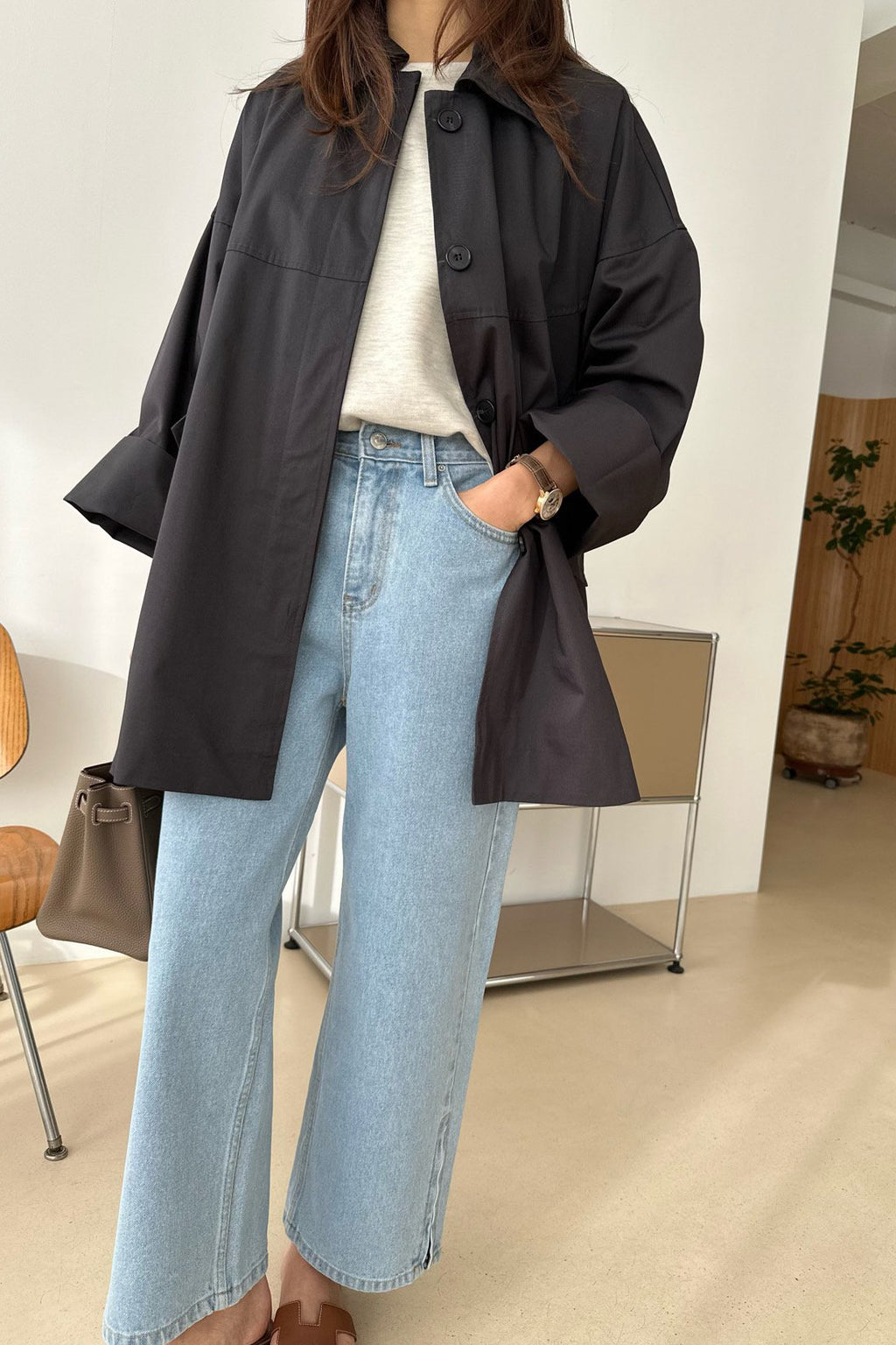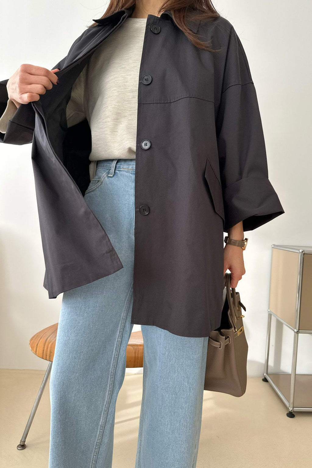 A lightweight spring trench designed with a soft raglan shoulder line that creates a naturally rounded silhouette. Crafted from high-density twill fabric with a subtle sheen, it offers a refined yet effortless look perfect for everyday layering. The sleeves are finished with a gentle A-line shape, enhancing the relaxed, feminine feel while maintaining a comfortable oversized fit. Easy to throw on over tees, knits, or dresses, this versatile jacket will be your go-to outerwear throughout the season.