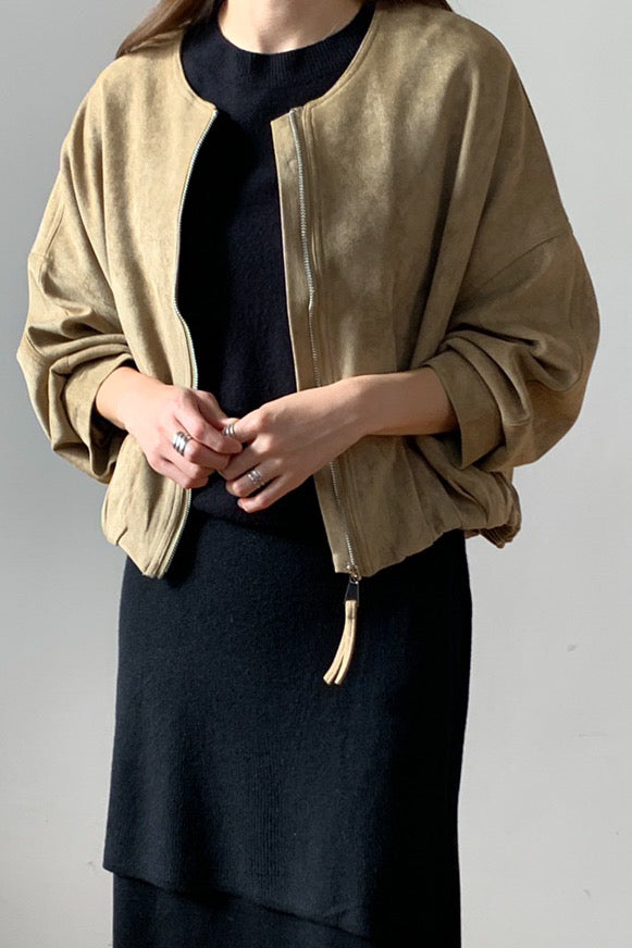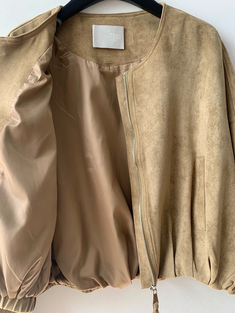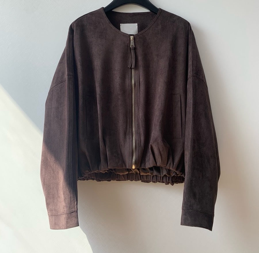 A modern twist on a classic silhouette, this suede blouson jacket features a clean, collarless neckline and a subtle balloon shape for an elevated, sculptural fit. The soft faux suede adds rich texture, while the zip closure and gathered hem provide structure without stiffness. Perfect for layering over knits or dresses for a refined yet relaxed autumn look.
