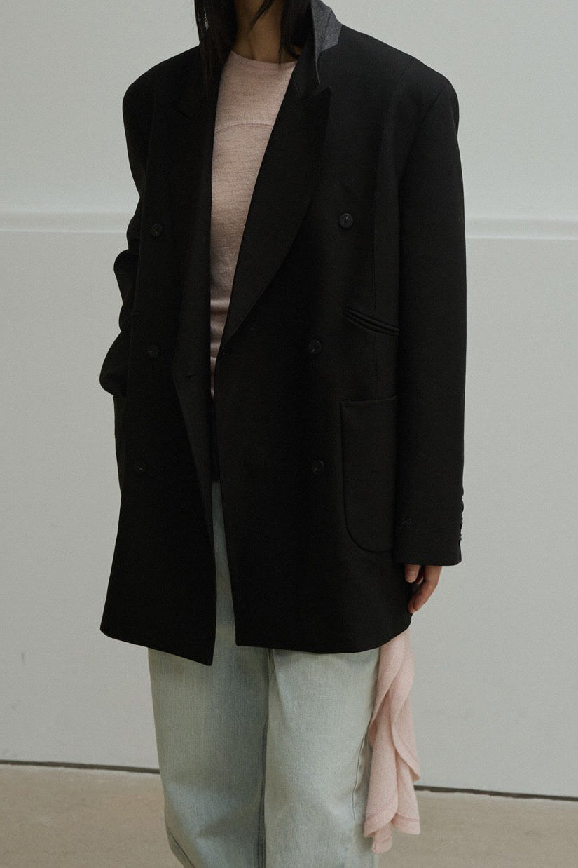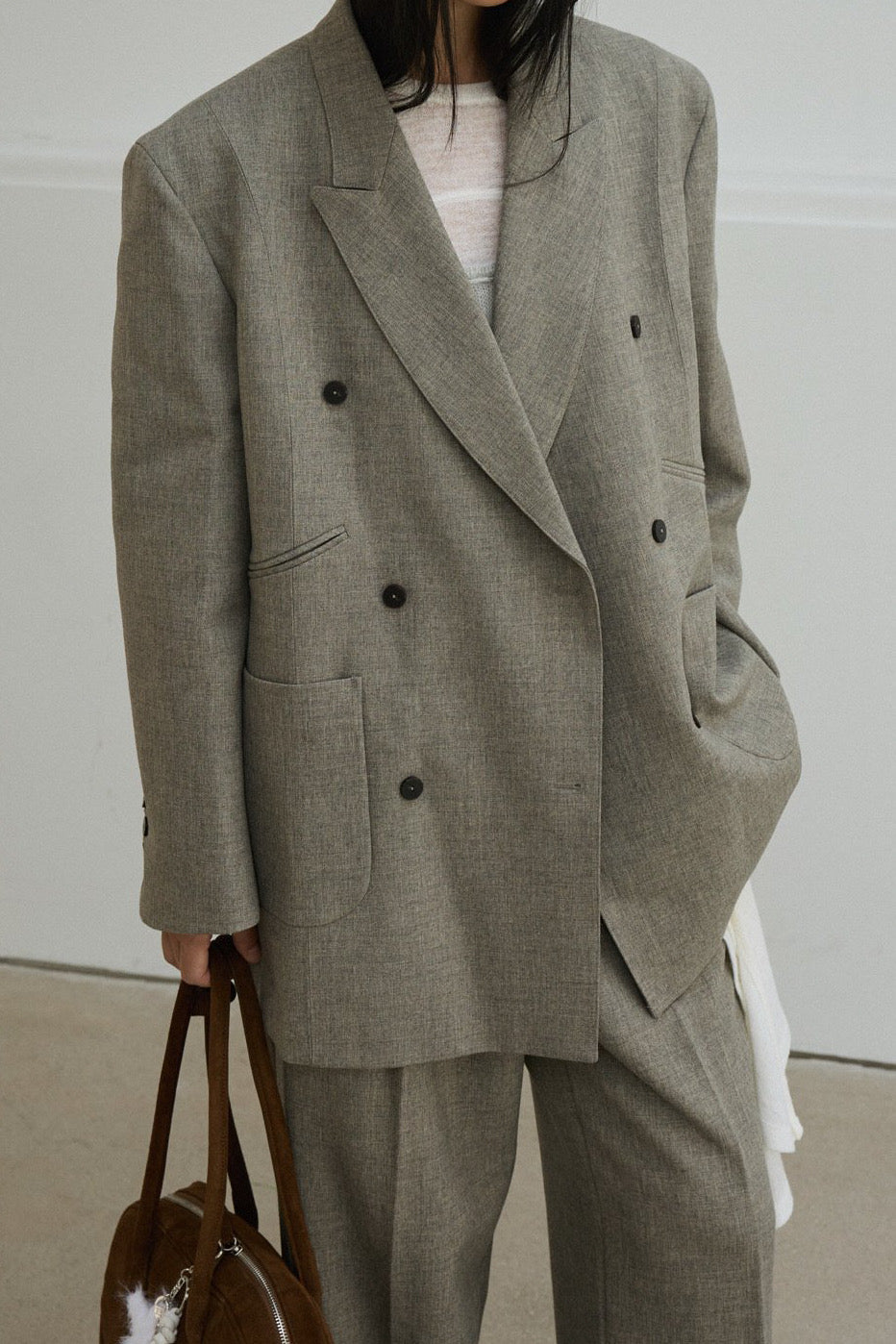 A modern classic reimagined, the Ive Blazer Set pairs a double-breasted, oversized jacket with long-line tailored slacks. The blazer features a boxy silhouette with flap and chest pockets for clean functionality, while the wide-leg trousers offer a maxi-length cut that elongates the frame. Designed for a genderless, structured look with just the right edge—perfect worn together or styled solo.