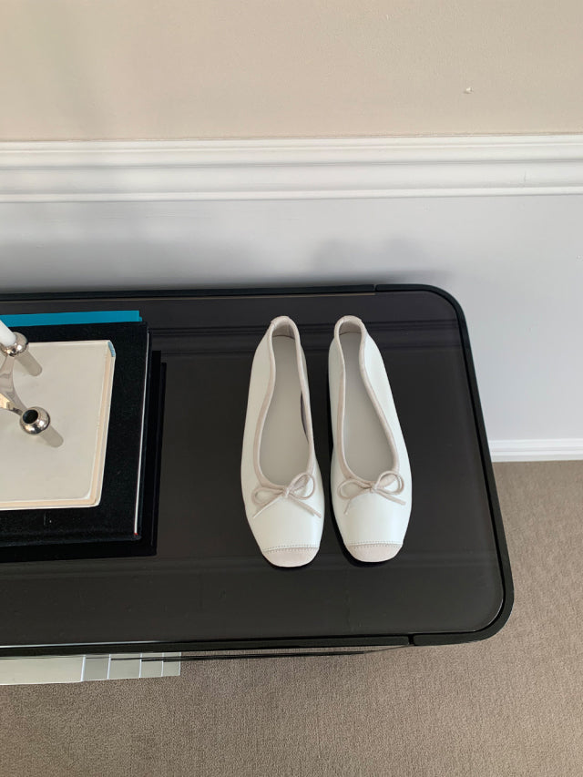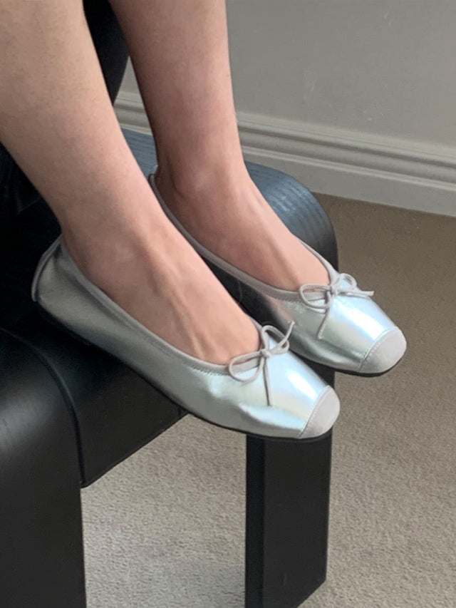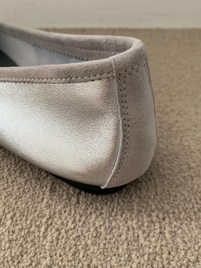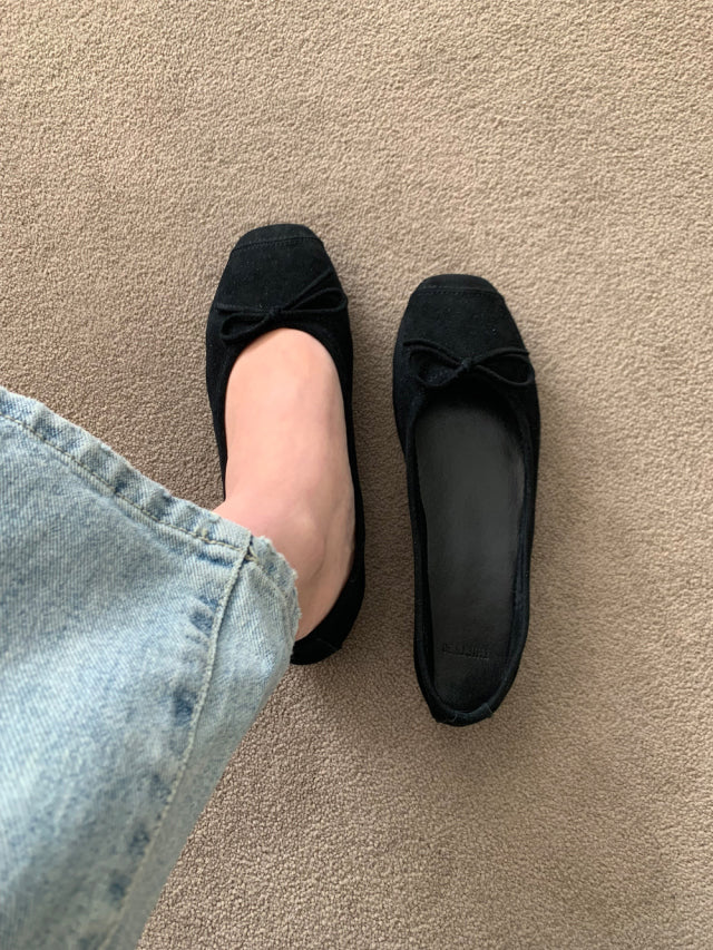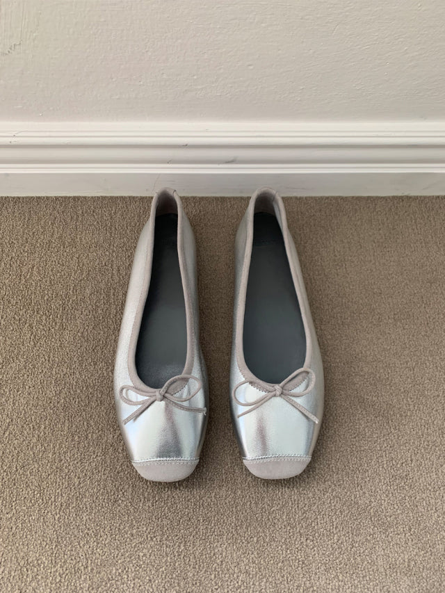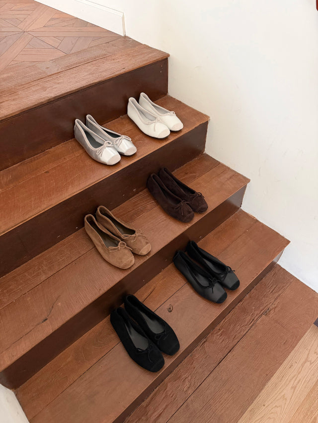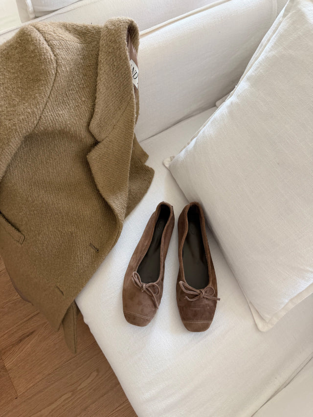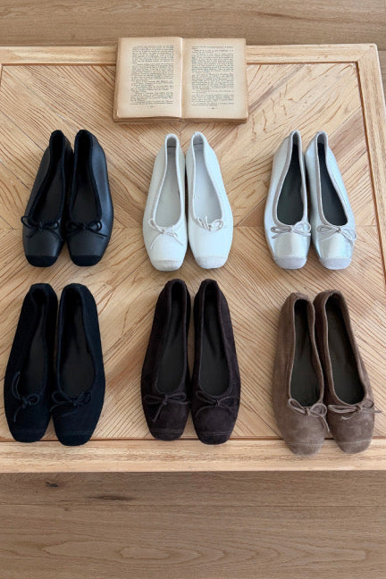 A modern take on the classic ballerina, the this flat features a rounded square toe and a subtle cap detail for added dimension. Finished with a petite bow and low-cut vamp, it’s the kind of everyday flat that feels both polished and effortless. Available in a range of versatile shades—from creamy ivory and cool silver to deep chocolate and black suede—this pair blends comfort with timeless charm.