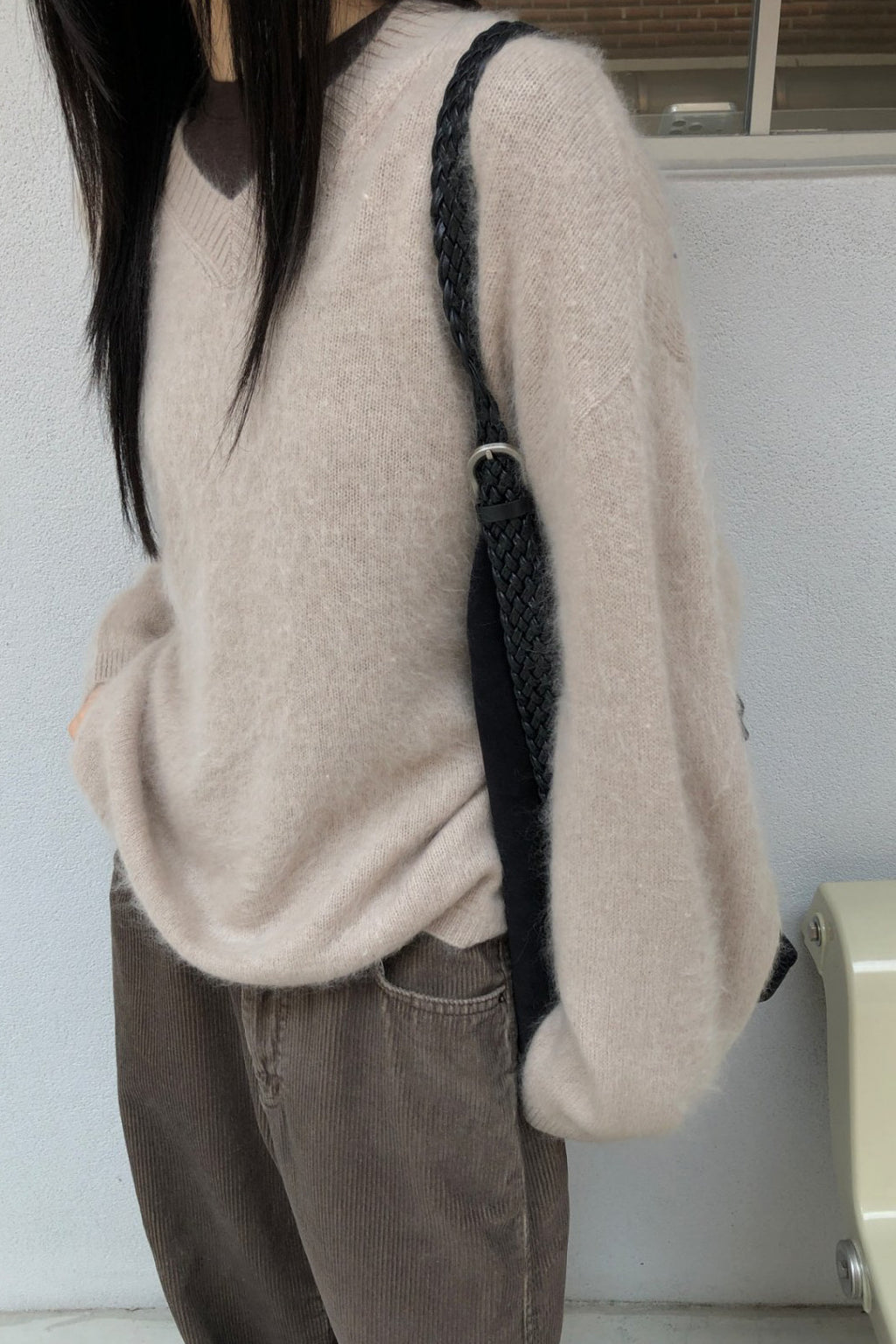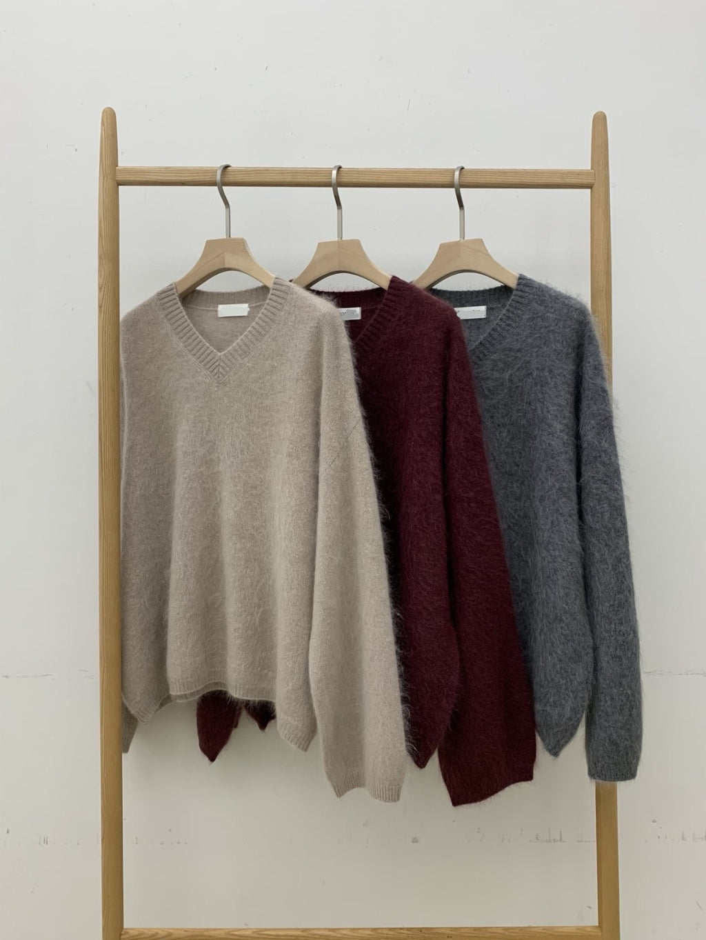 A high-quality brushed V-neck sweater with exceptional warmth and a beautifully soft, fluffy texture.