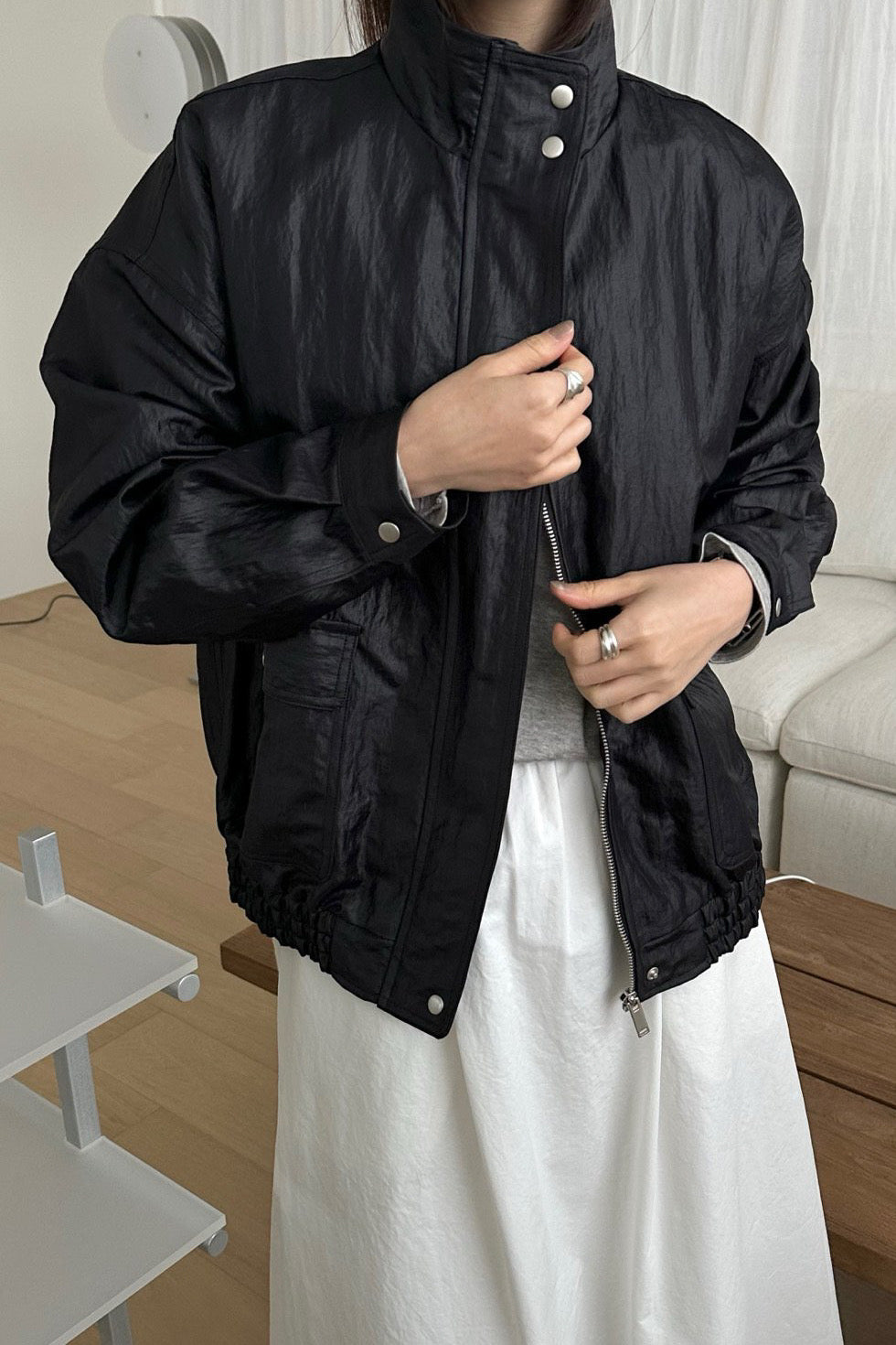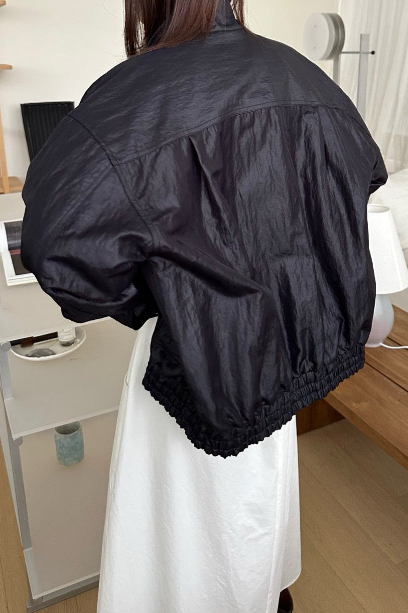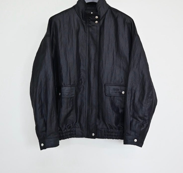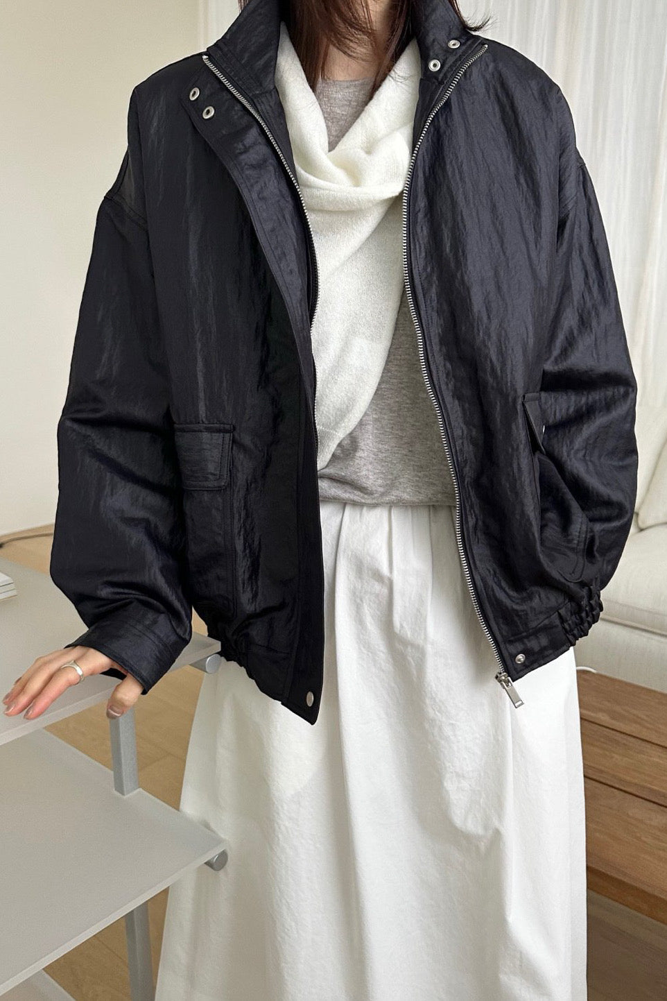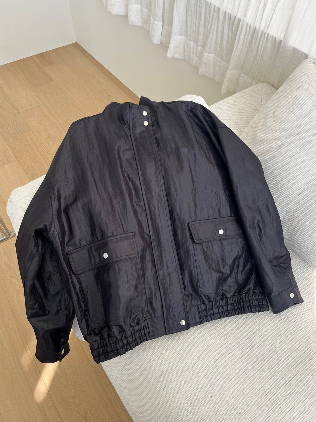 A transitional season jumper designed with a subtle glossy finish that adds a modern, elevated touch. The lightly structured fabric and full lining provide comfortable wear, while the elastic banded hem creates a clean, softly gathered silhouette. Finished with snap buttons and practical flap pockets, it blends utility details with a refined mood—perfect for layering over tees, knits, or dresses during in-between weather.