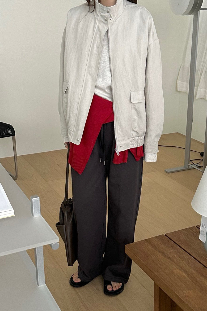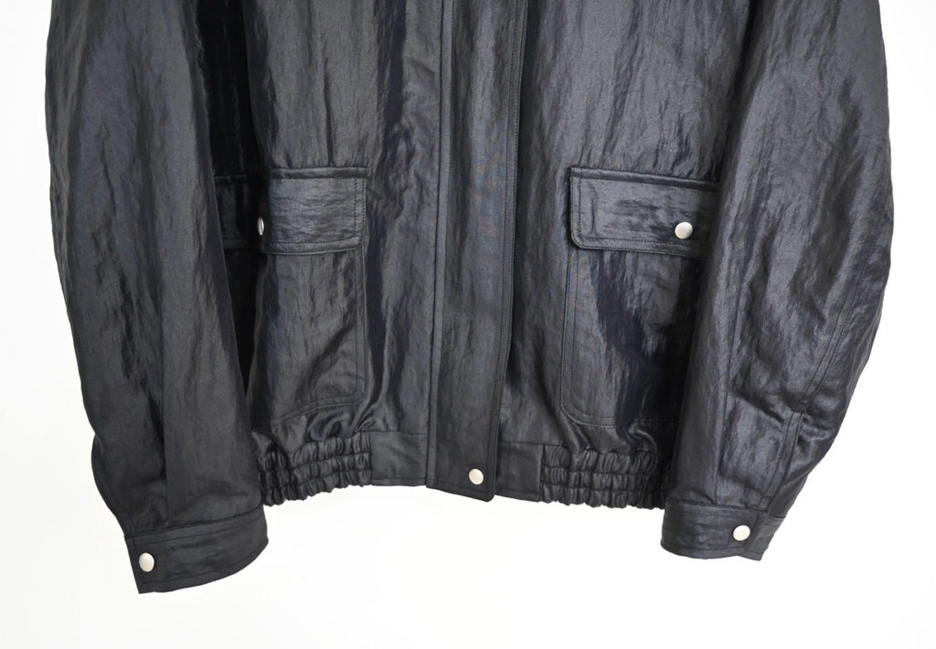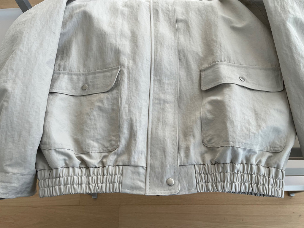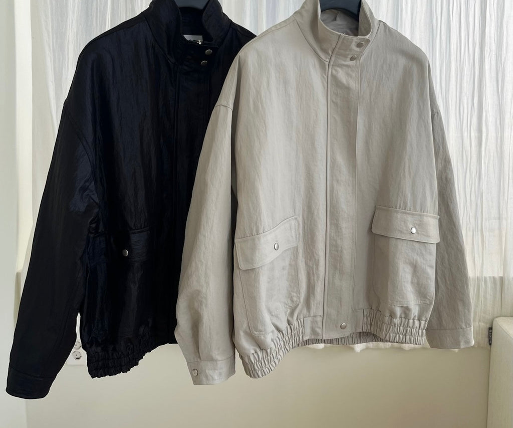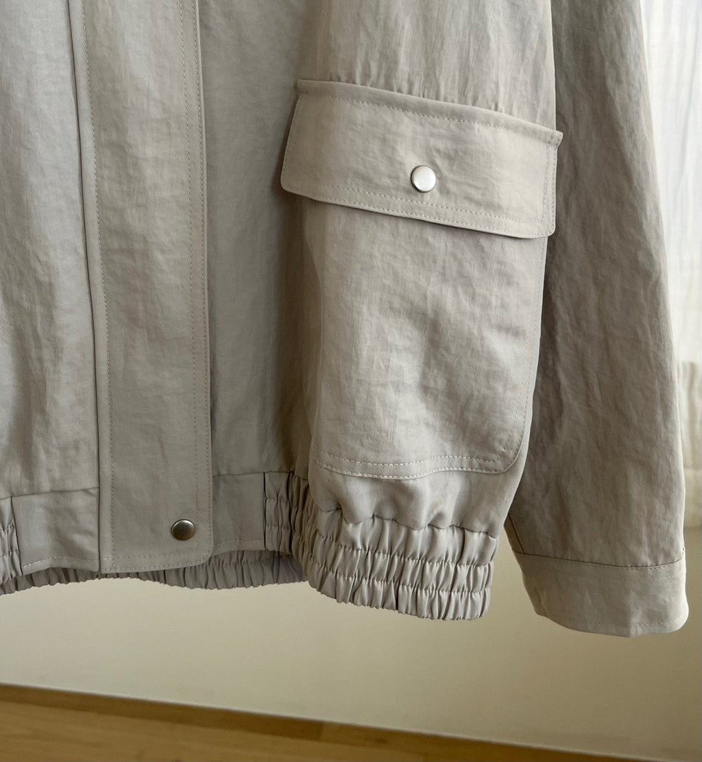 A transitional season jumper designed with a subtle glossy finish that adds a modern, elevated touch. The lightly structured fabric and full lining provide comfortable wear, while the elastic banded hem creates a clean, softly gathered silhouette. Finished with snap buttons and practical flap pockets, it blends utility details with a refined mood—perfect for layering over tees, knits, or dresses during in-between weather.