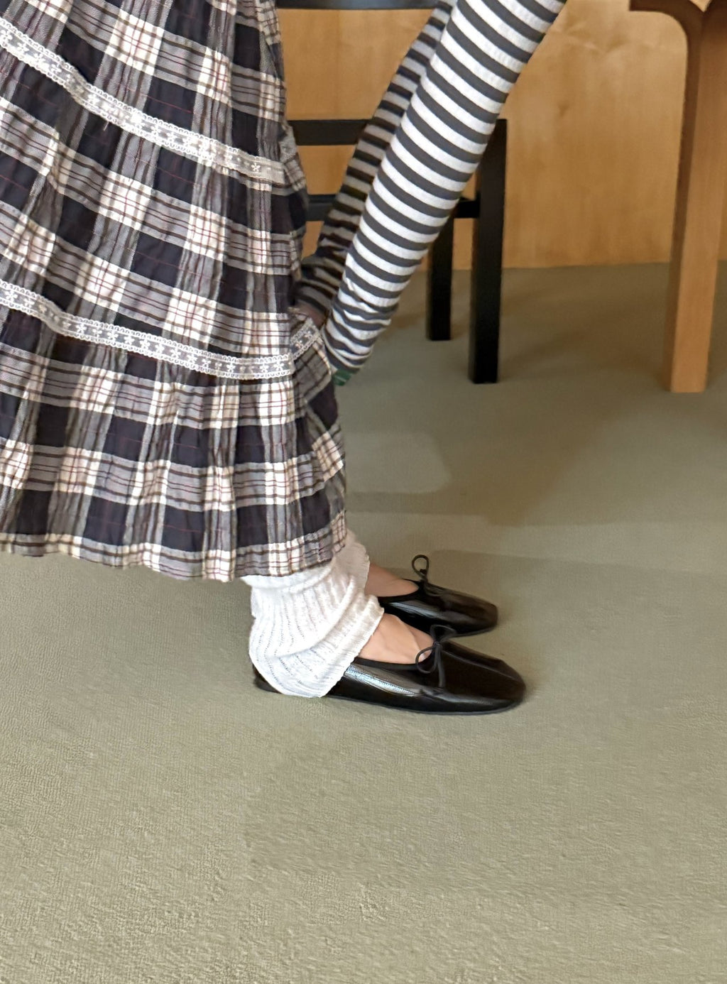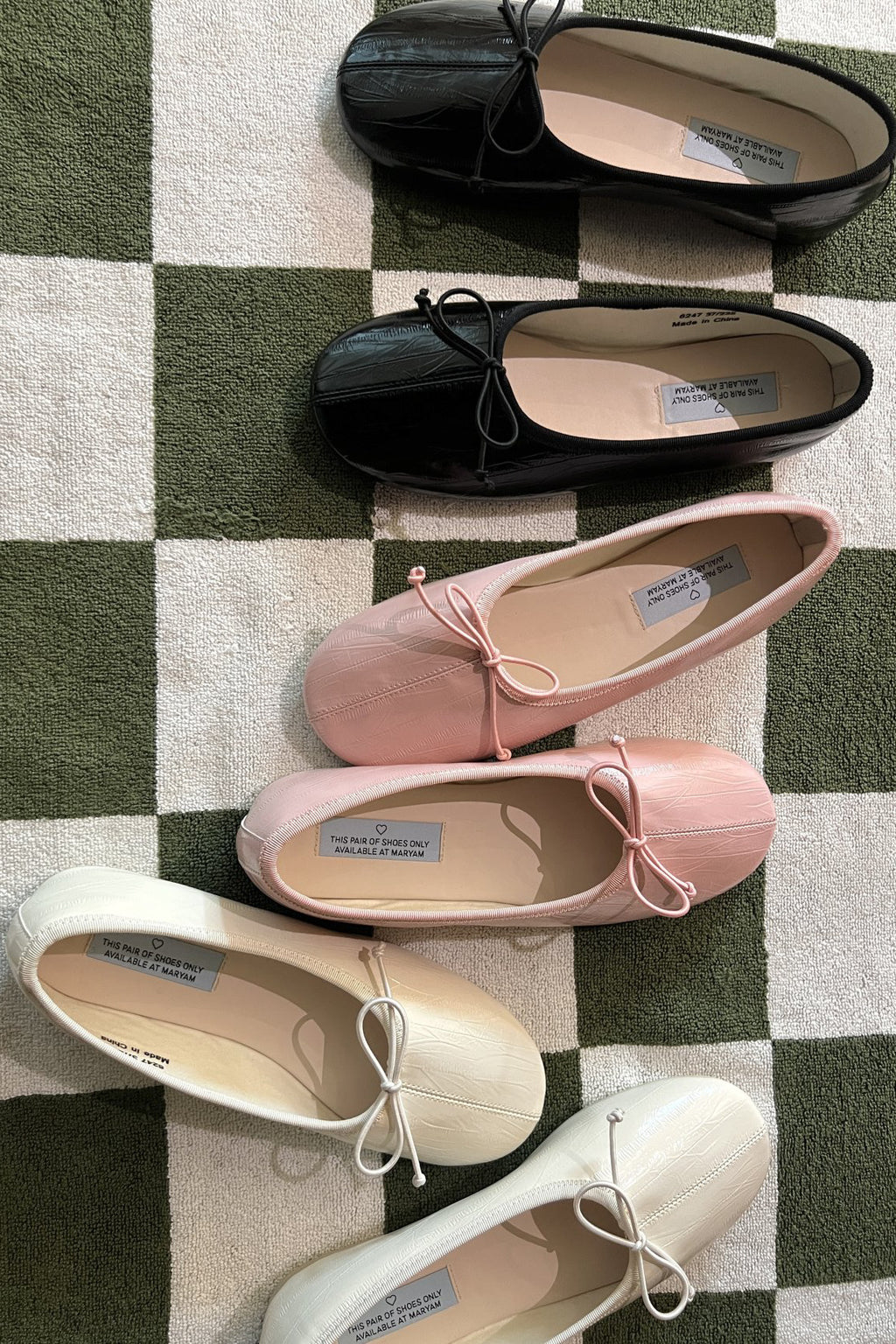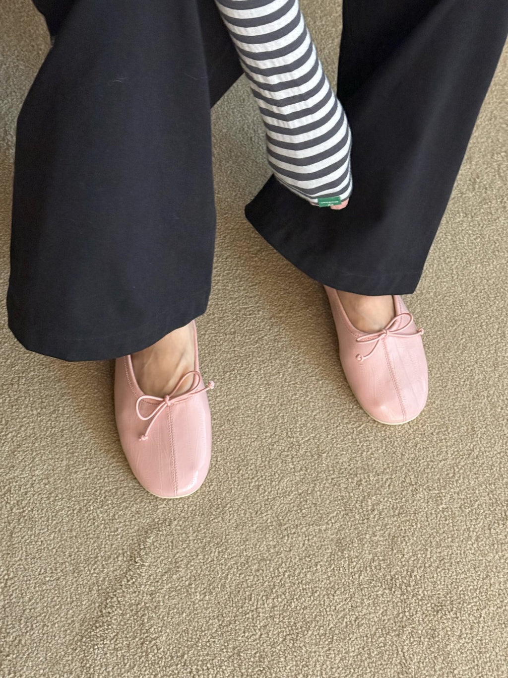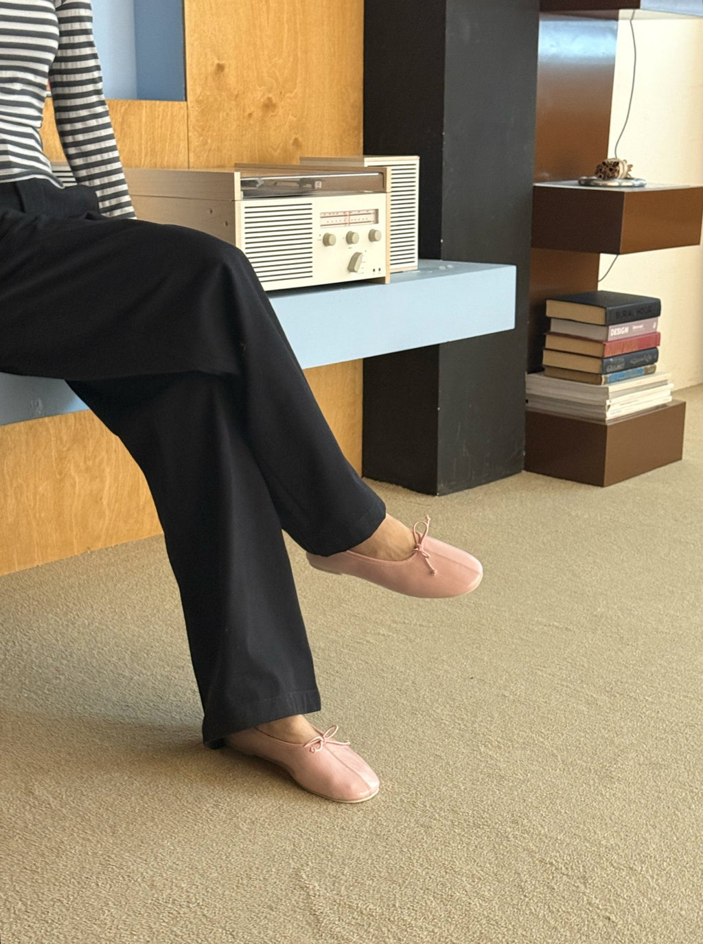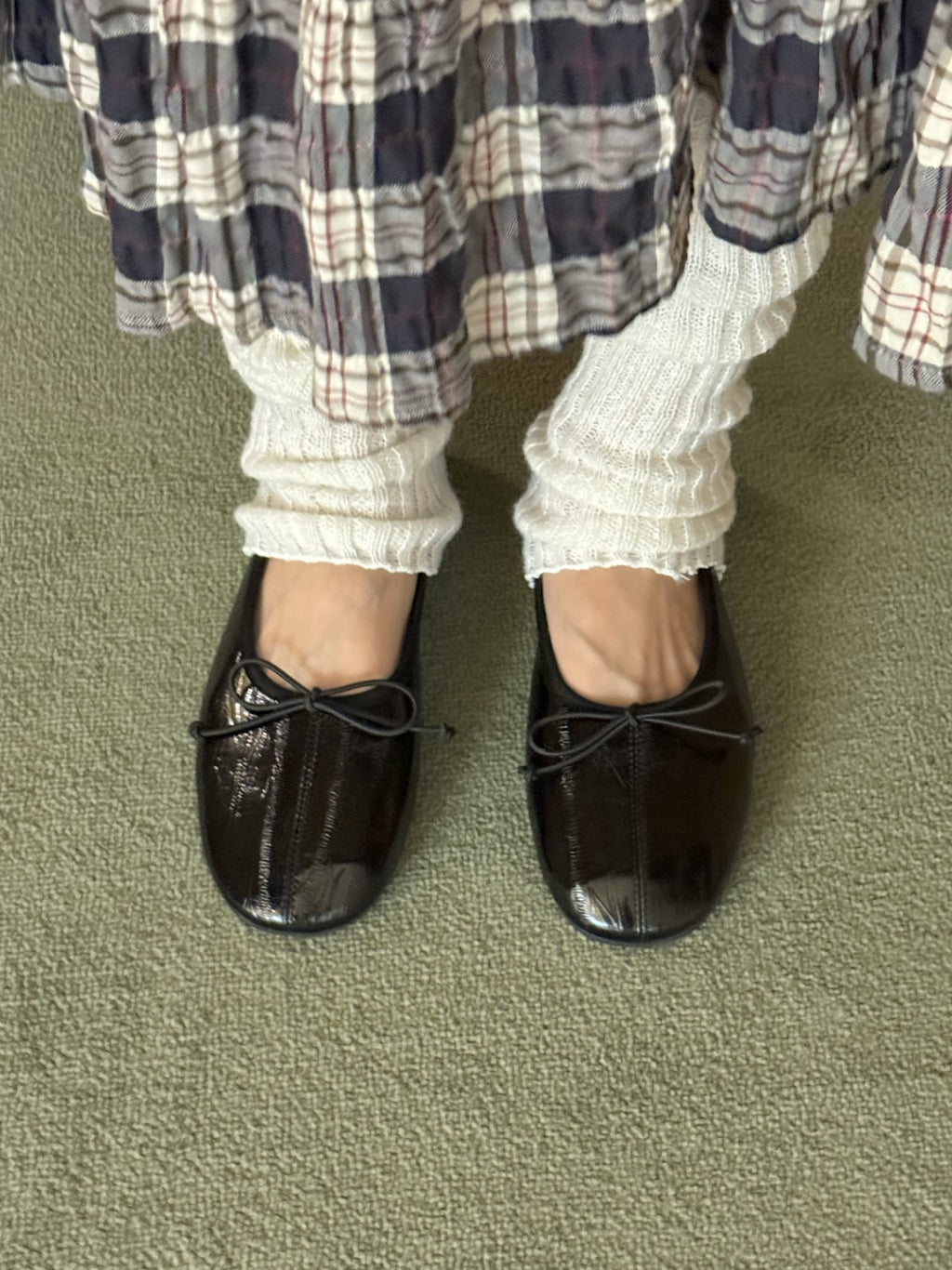 A classic ballet flat crafted in a subtly glossy texture that adds a refined, luminous touch without feeling overdone. The center stitch detail along the toe creates a clean, modern point, while the slim ribbon accent brings a soft, feminine charm. Designed with a low 1cm heel and lightweight feel, these flats offer effortless comfort for everyday wear—perfect with denim, dresses, or tailored pants.