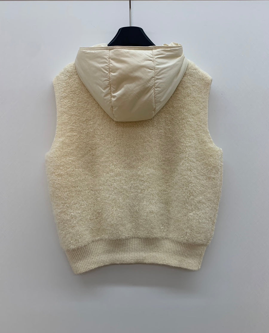 A cozy zip-up vest combining a soft bouclé body with a lightweight padded hood.