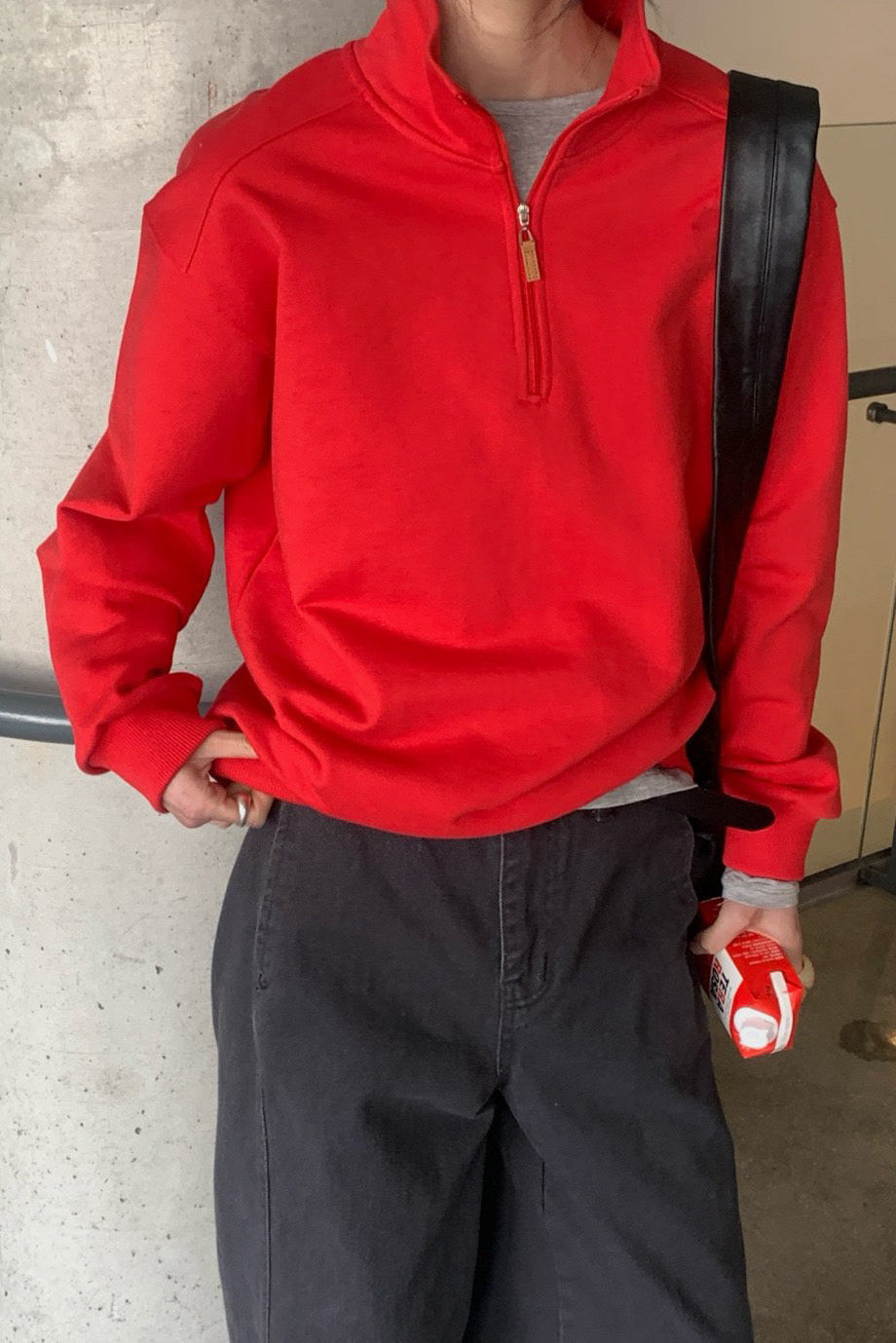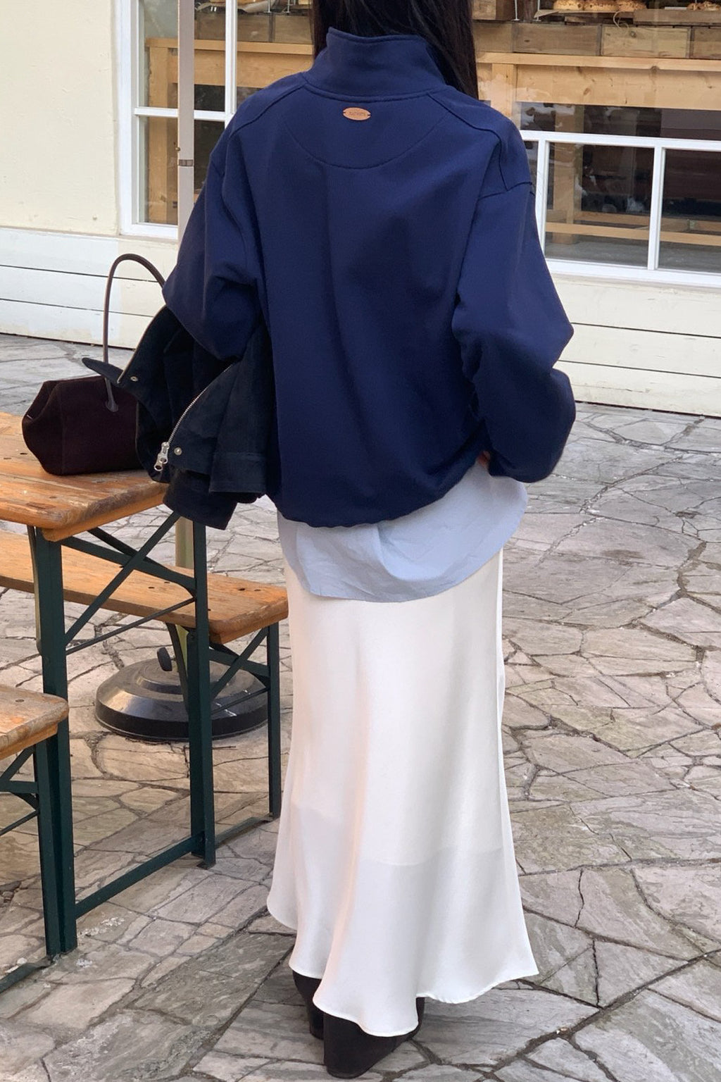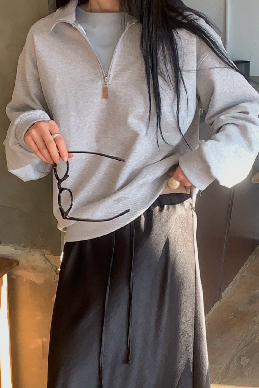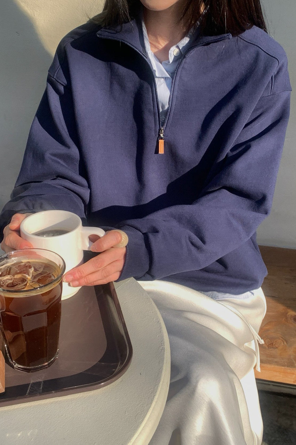 Designed with a versatile half-zip closure, it can be styled as a high-neck or folded into a relaxed collar for different moods. A loose, shoulder-enhancing oversized silhouette provides comfortable coverage, while the clean, balanced length ensures a neat and effortless outfit finish.