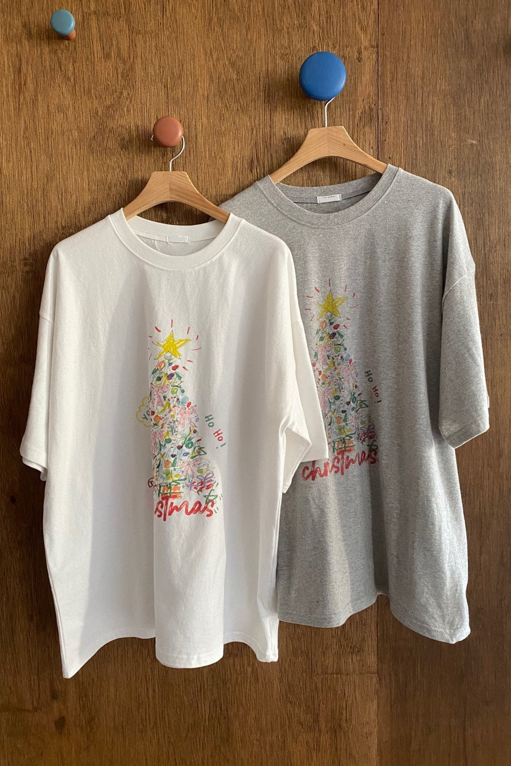 A cheerful and festive loose-fit Christmas T-shirt featuring a playful hand-drawn style Christmas tree print. The soft cotton fabric and relaxed silhouette make it perfect for layering and comfortable everyday wear throughout the holiday season.