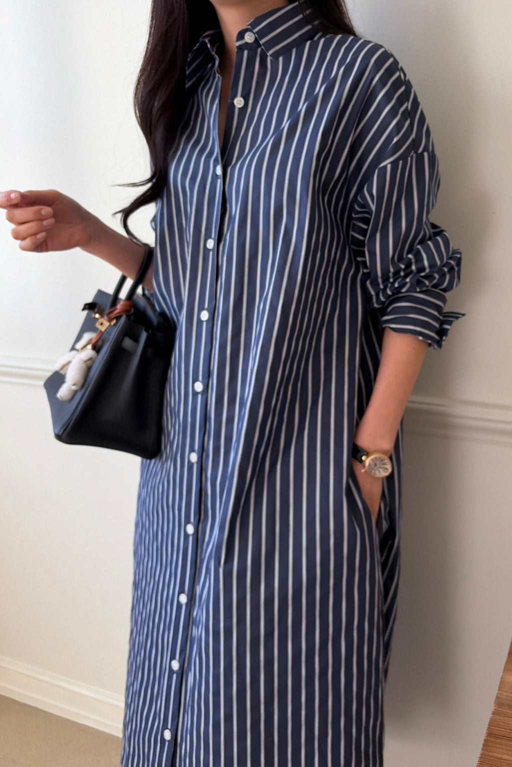 A timeless striped shirt dress with a relaxed, classic fit that allows for versatile styling.