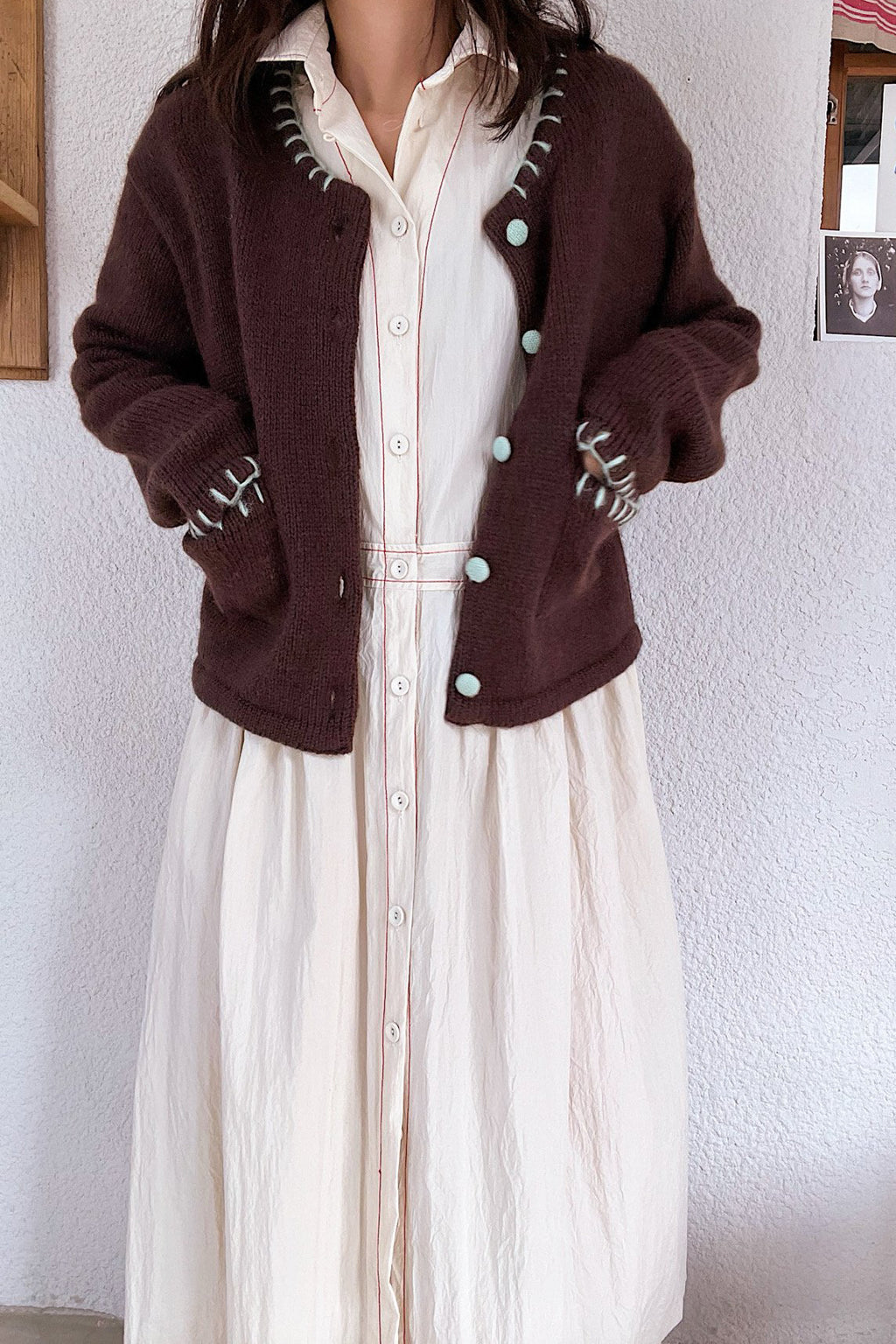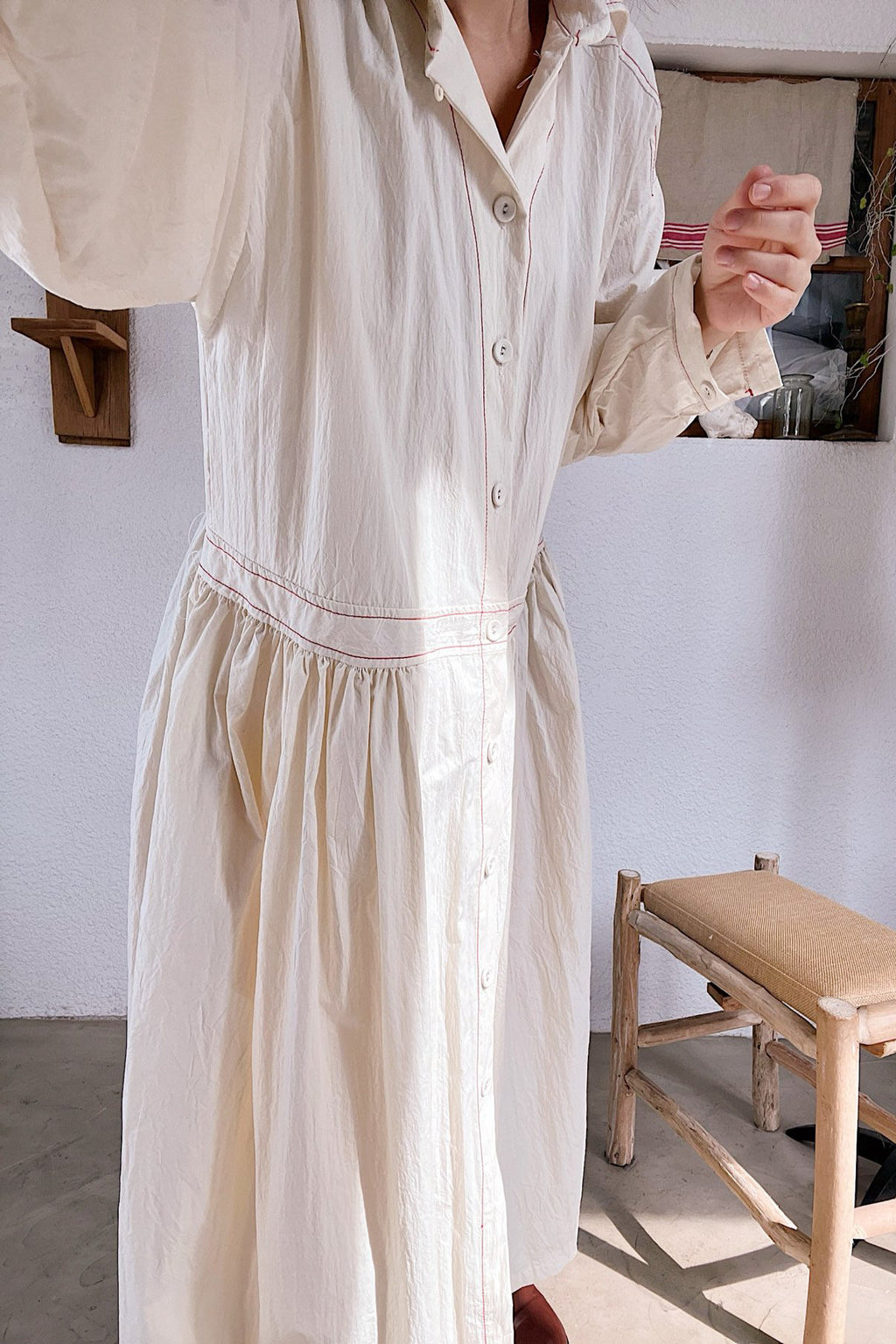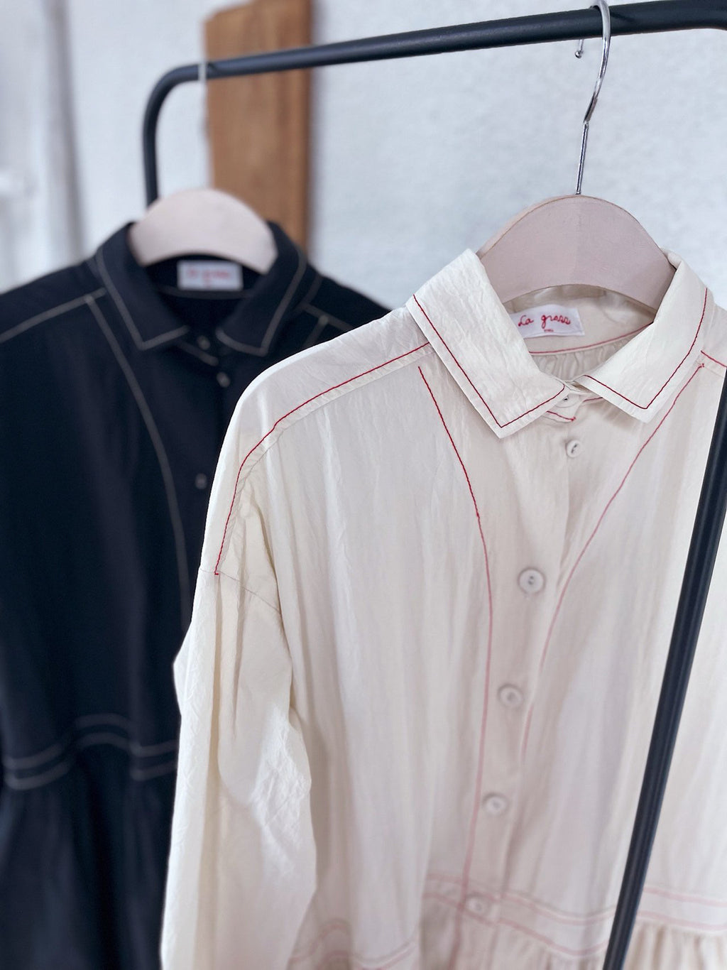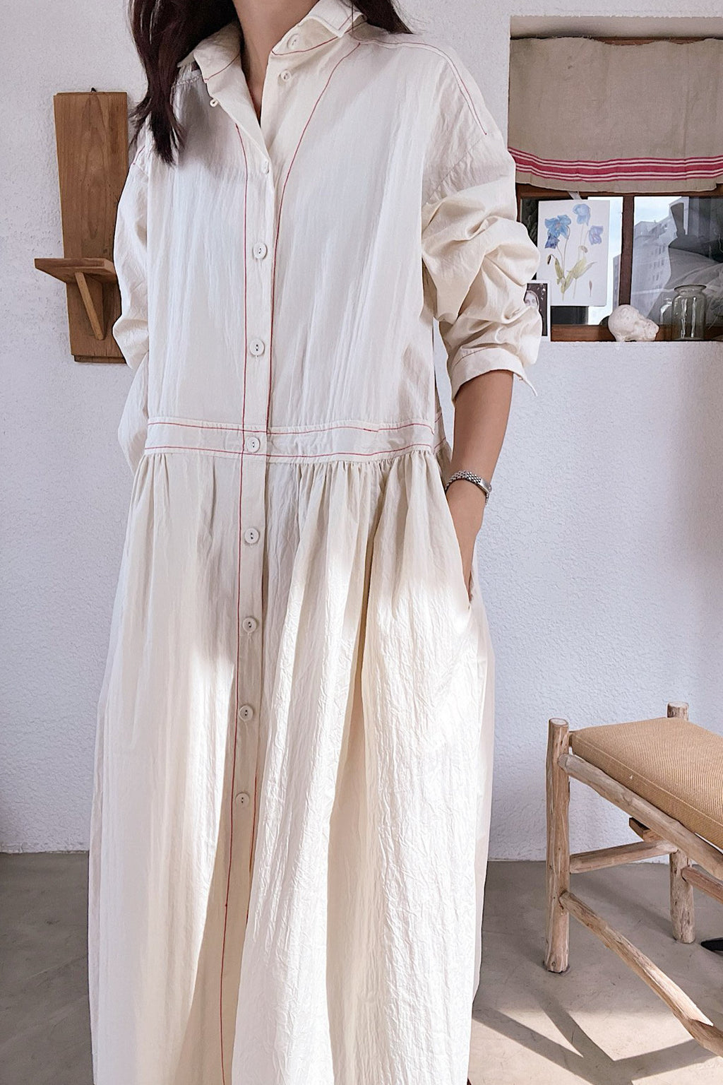 The Soft Stitch Shirt Dress is a relaxed-fit shirt dress crafted from a nylon-cotton blend with a soft, subtle sheen and natural wrinkle texture. Delicate contrast stitching adds quiet detail along the seams, elevating its minimal silhouette. With a classic collar, fabric-covered front buttons, and side pockets, it blends utility and understated charm. Its fluid drape and breathable fabric make it perfect solo or layered—ideal for transitional weather into early winter.