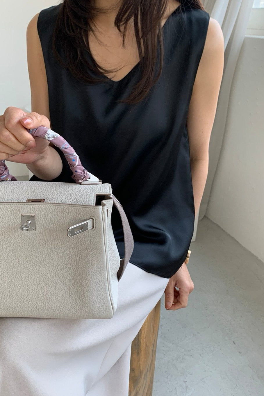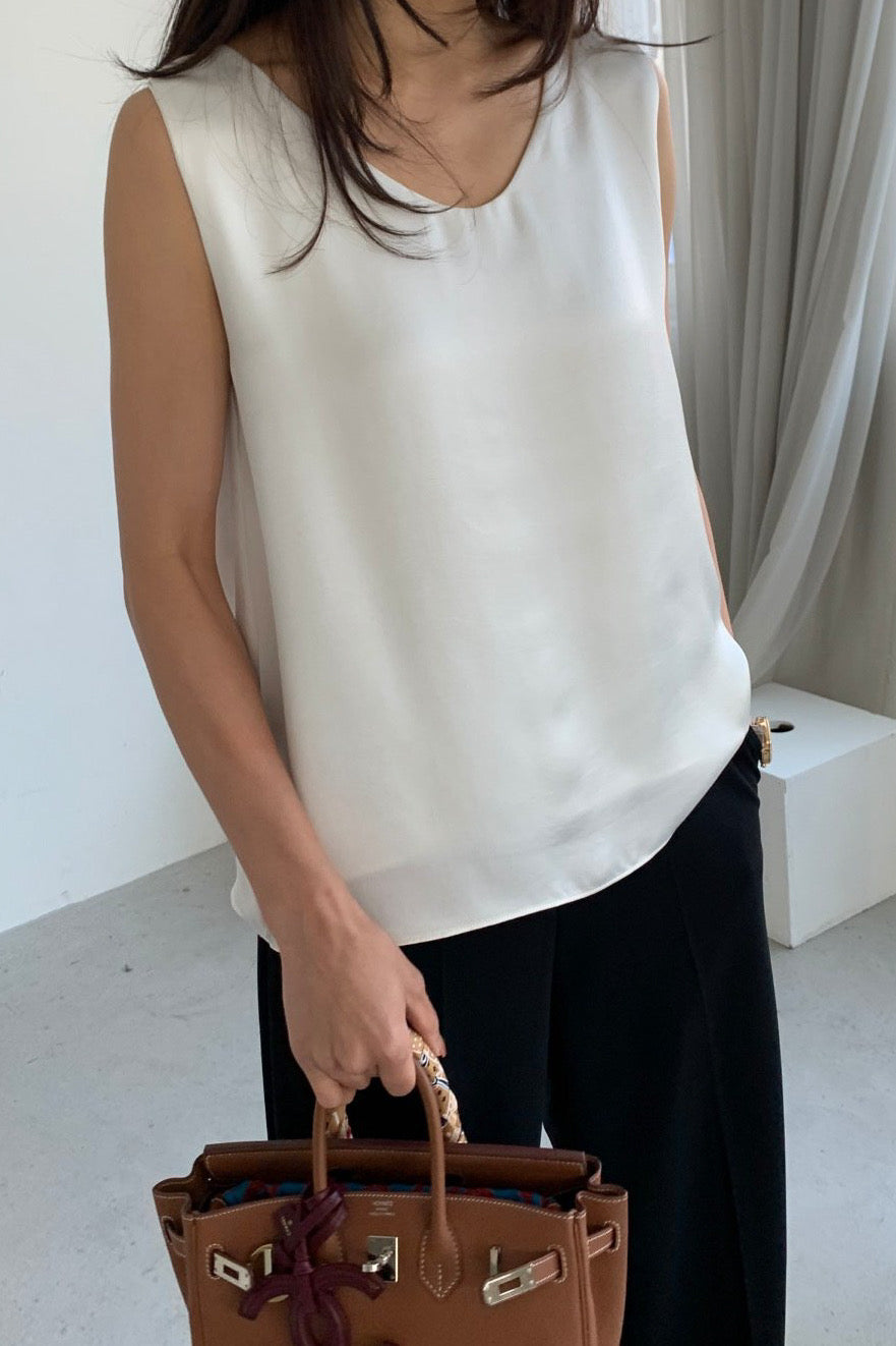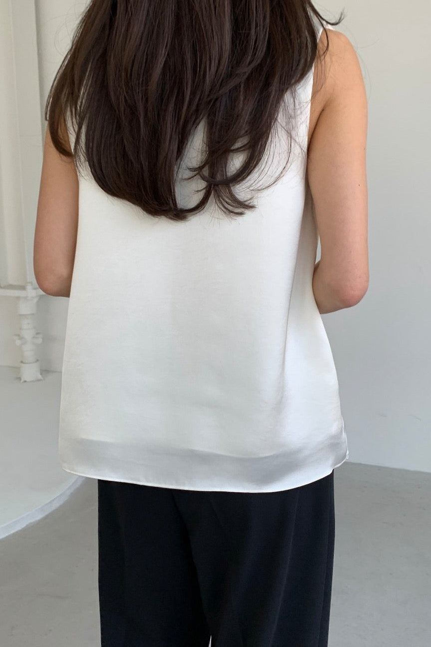 A sleeveless blouse crafted from a double-layered satin-finish poly that eliminates sheerness while keeping the drape effortlessly fluid. The V-neckline sits cleanly, the silhouette skims without clinging, and the subtle sheen elevates any pairing — tucked into tailored trousers or left loose over a midi skirt. Polished enough to stand alone, versatile enough to layer under a blazer.