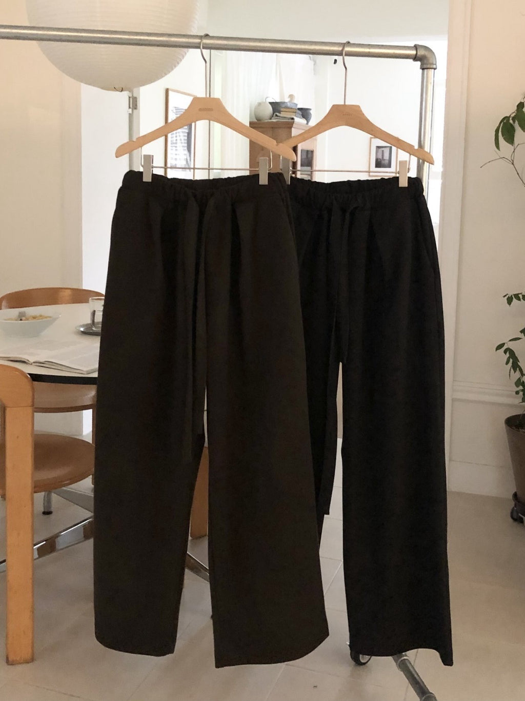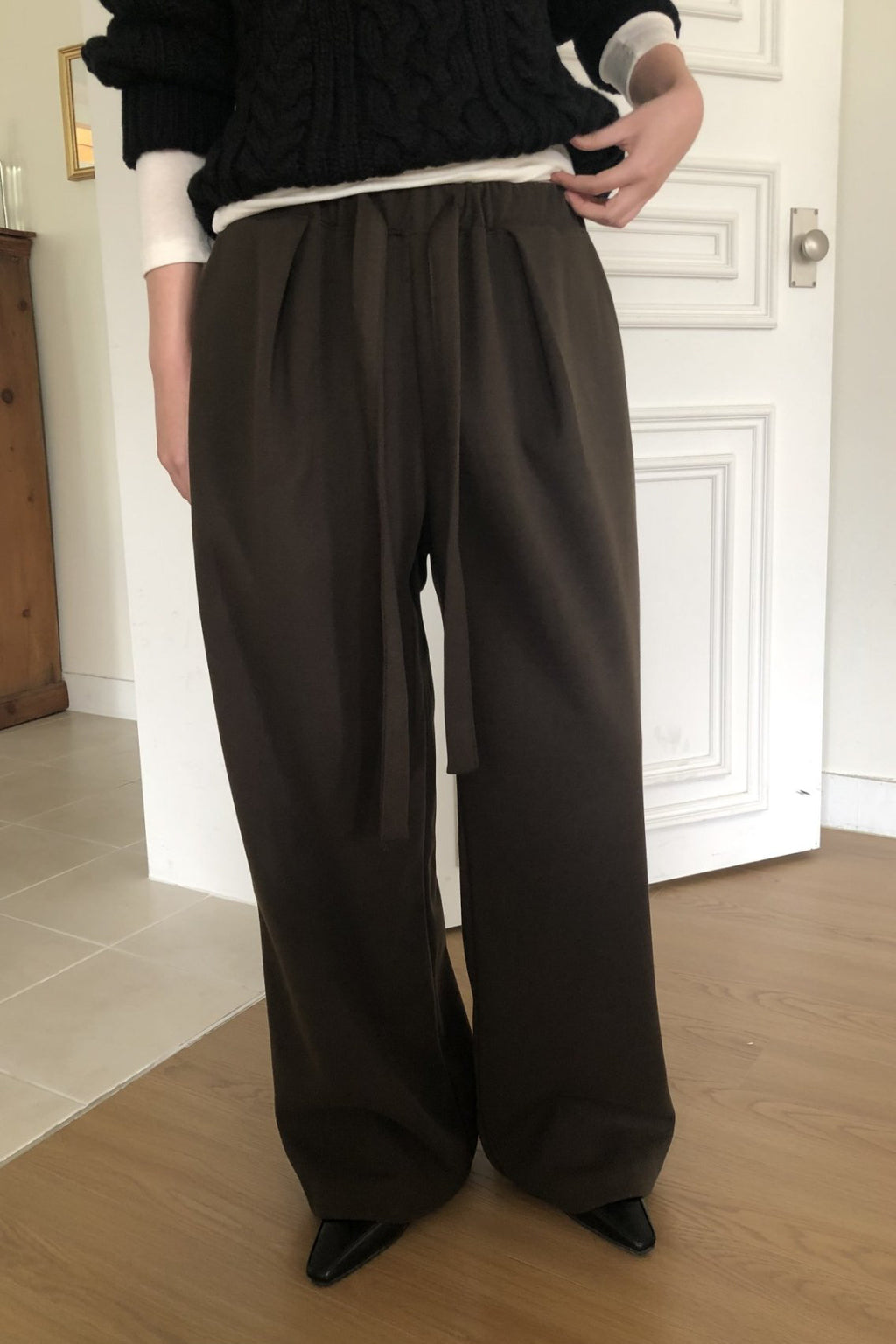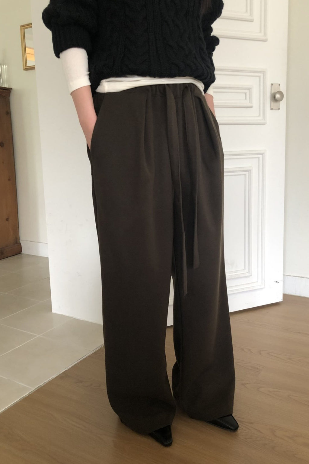 These relaxed slacks combine effortless comfort with a clean, modern silhouette. The full elastic waistband and soft drawstring tie create an easy, adjustable fit, while the subtle front pleats add gentle volume to the wide-leg shape. Made from a smooth, structured fabric, they drape beautifully without feeling heavy, making them ideal for everyday wear. Back patch pockets give a casual touch, balancing the tailored look. Pair them with knits, shirts, or simple tees for a cozy yet refined outfit.