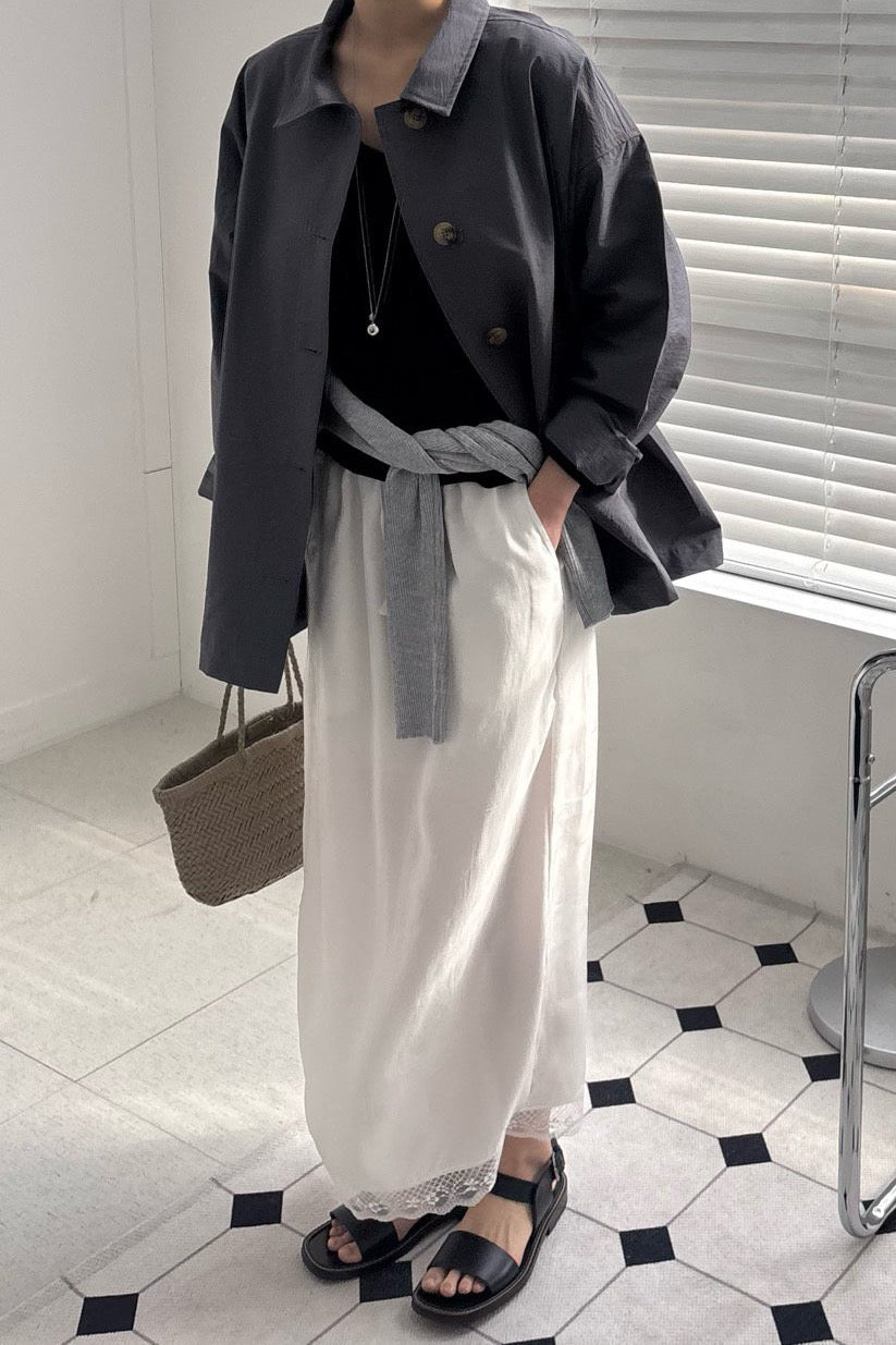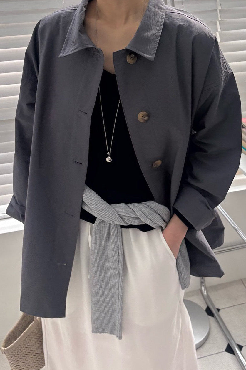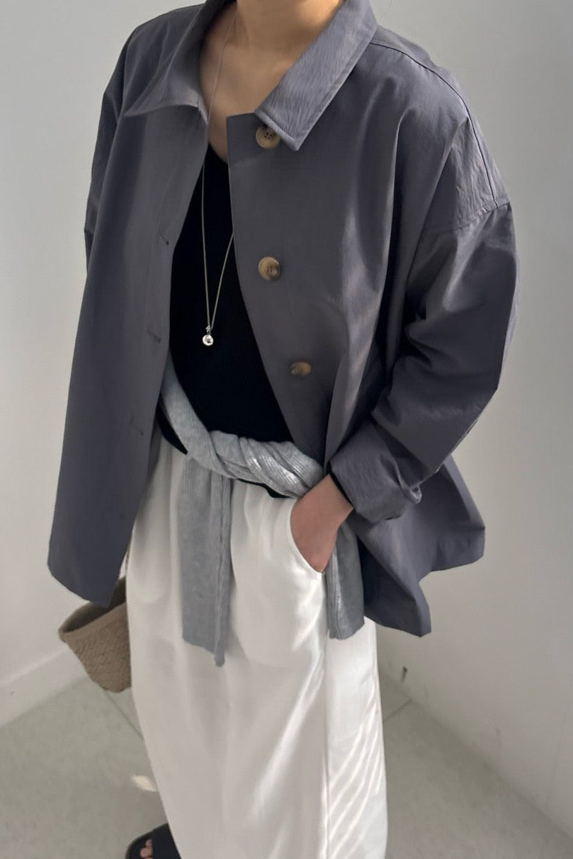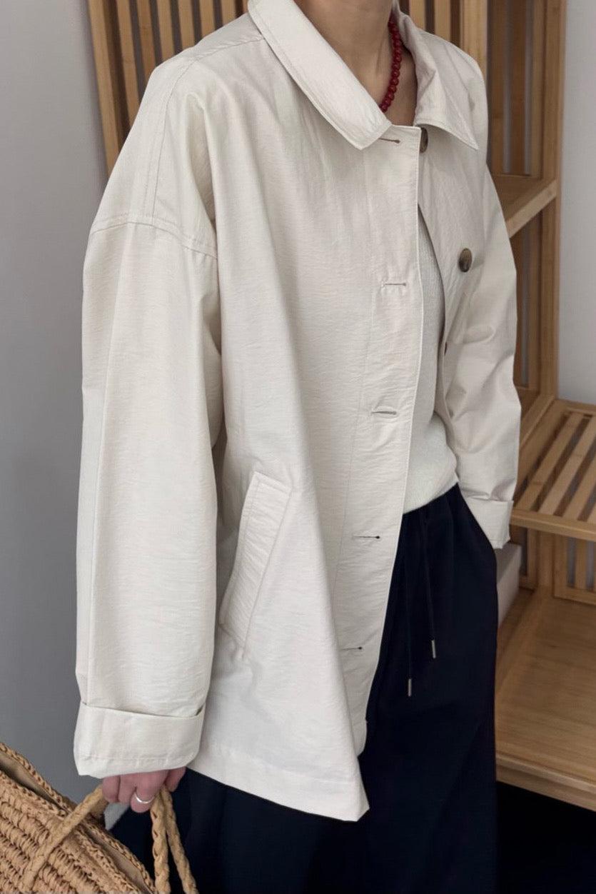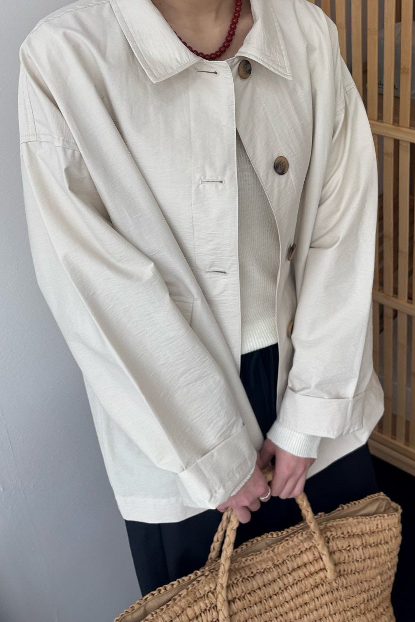 A simple and refined half-length jacket designed with a clean silhouette and relaxed fit. Made from a lightweight fabric with no lining, it offers a comfortable, easy-to-layer feel perfect for transitional seasons. The minimal button-front closure and soft structure create an effortlessly polished look, making it ideal for both casual and smart styling.