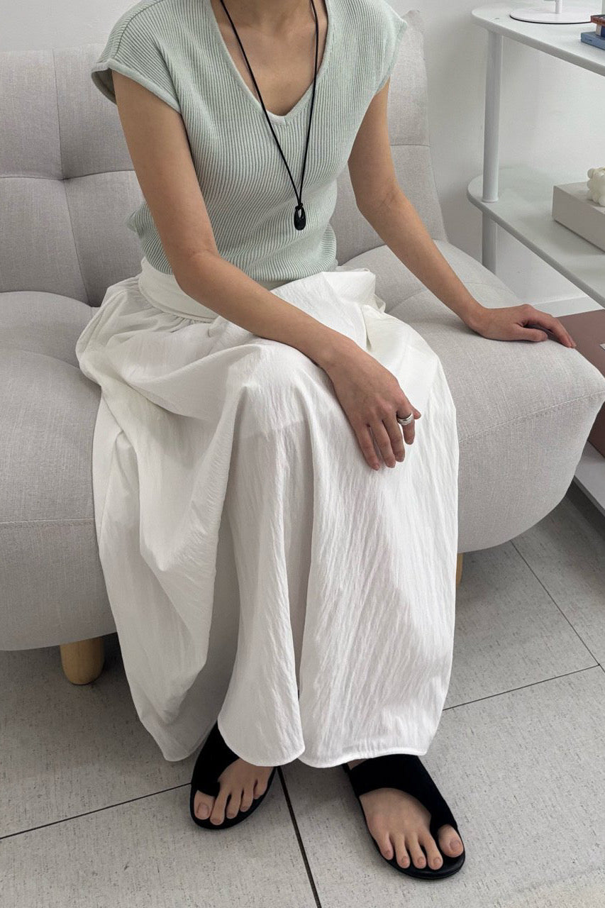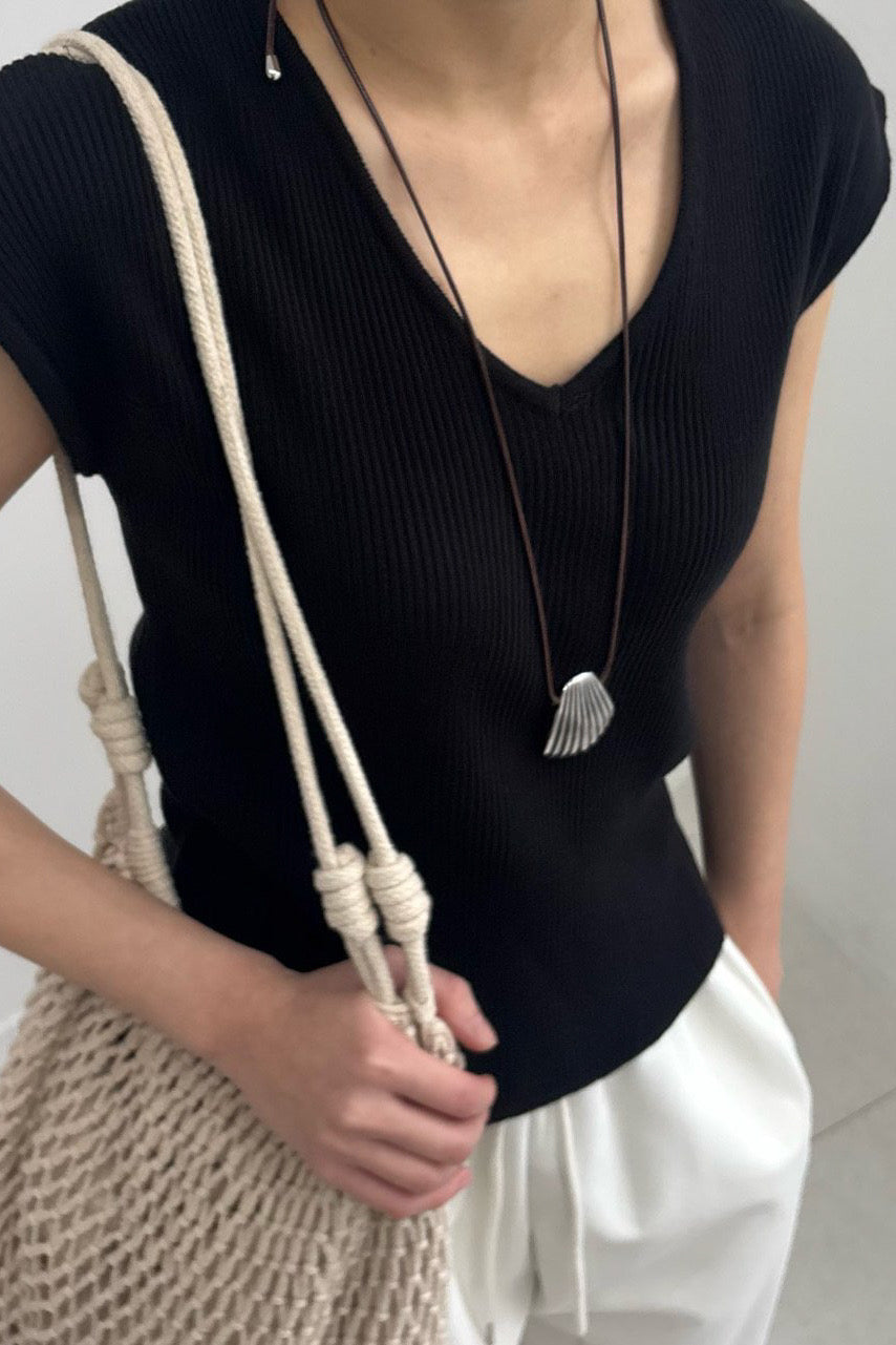 A clean and minimal rib-knit top designed with a flattering V-neck and soft cap sleeves. The slim rib texture gently follows the body, creating a neat and feminine silhouette.