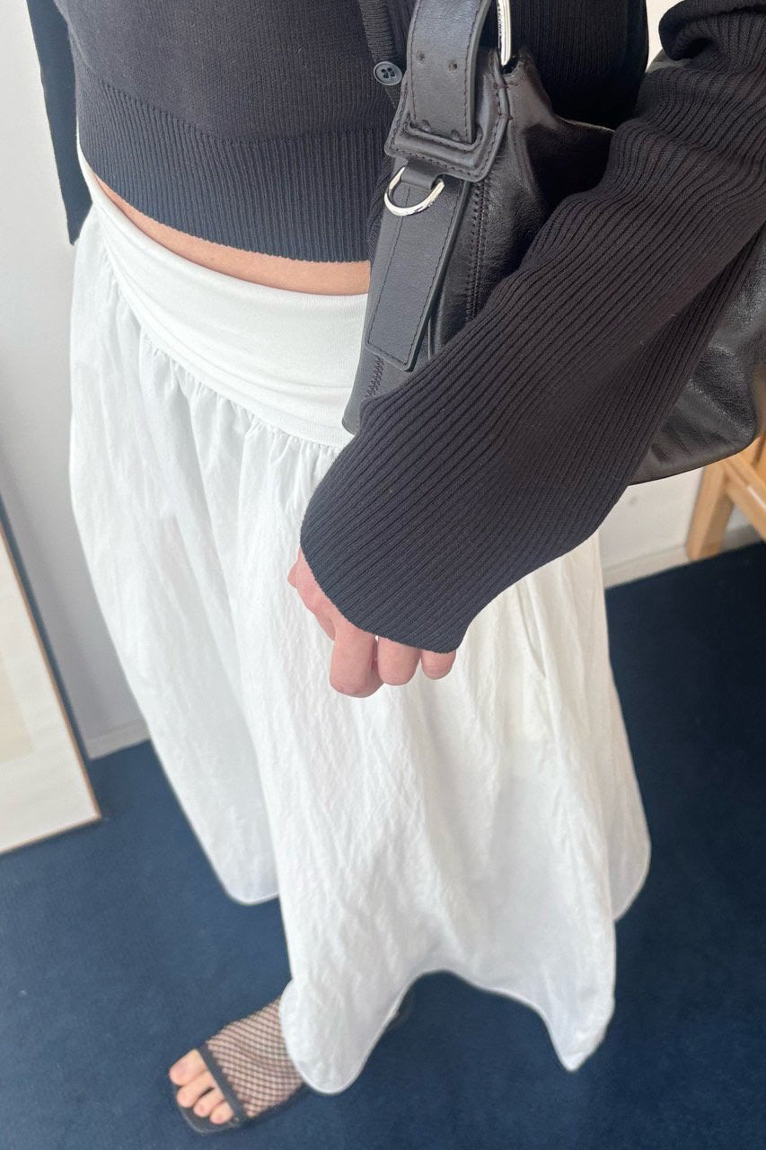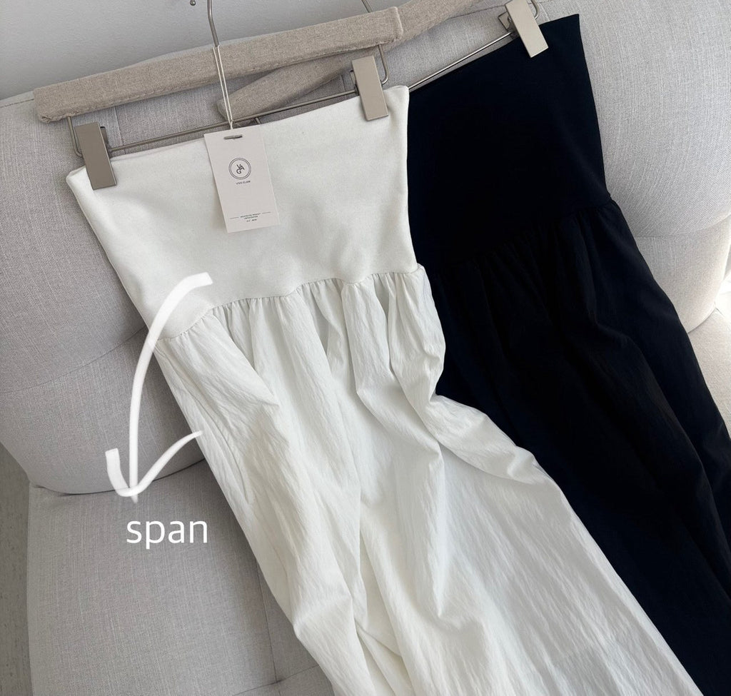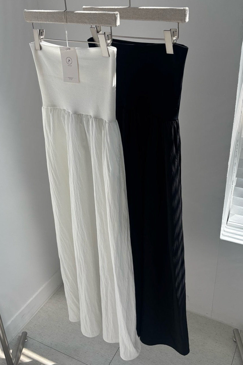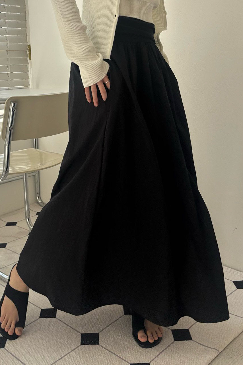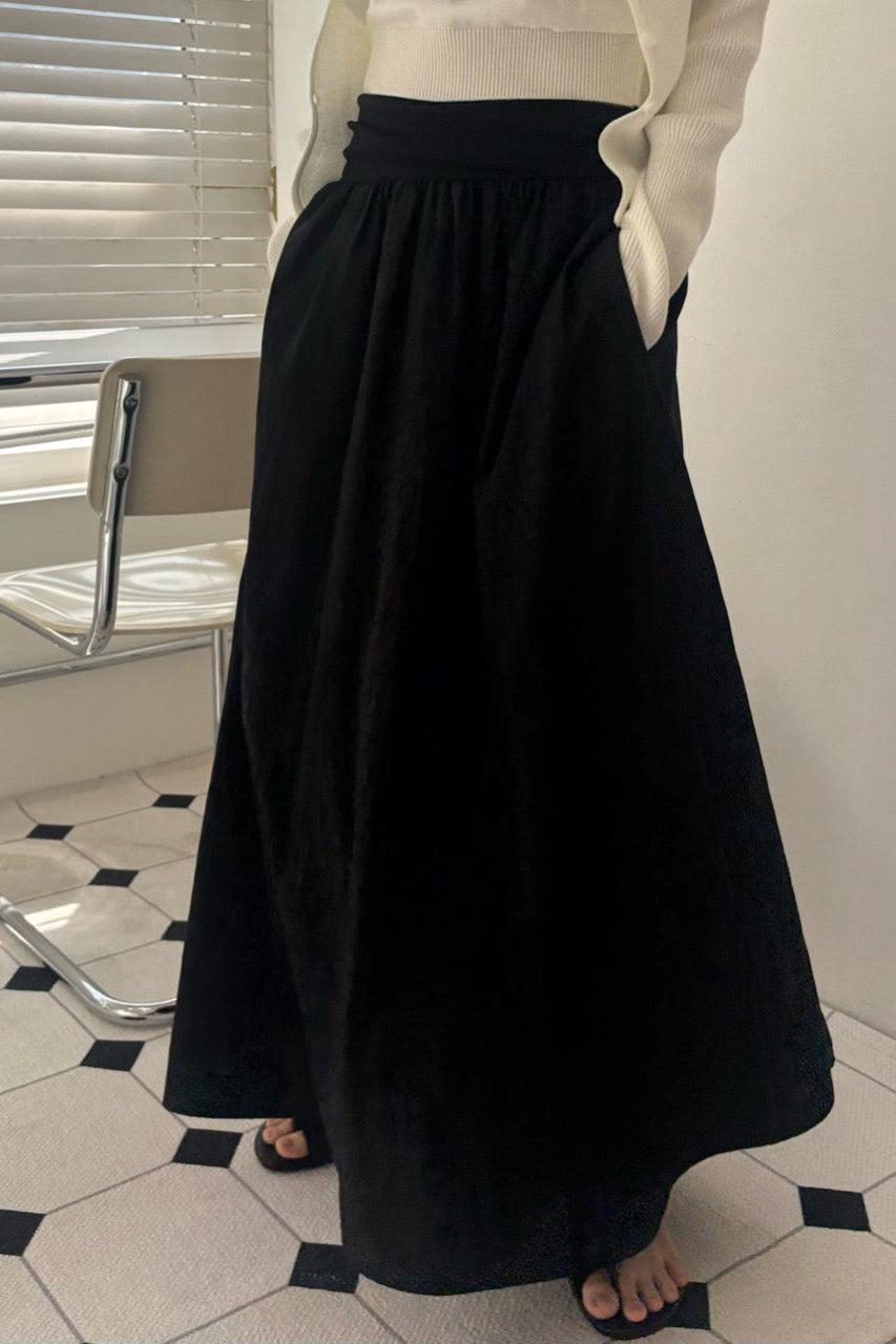 A graceful long skirt designed with a soft elastic waistband that offers both comfort and a clean, flattering fit. The wide waistband gently hugs the waist while creating a smooth transition into the flowing silhouette.