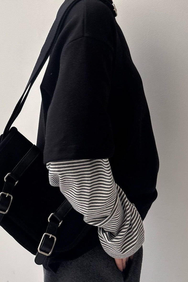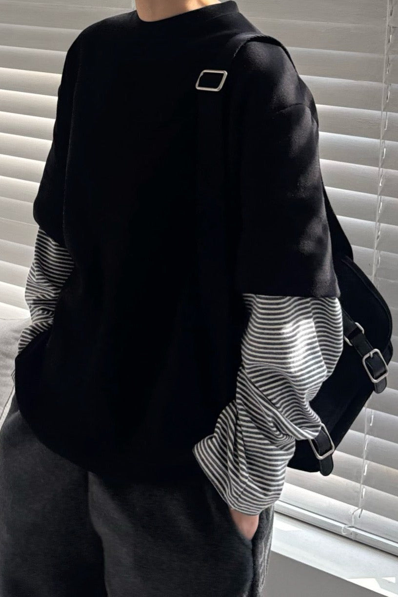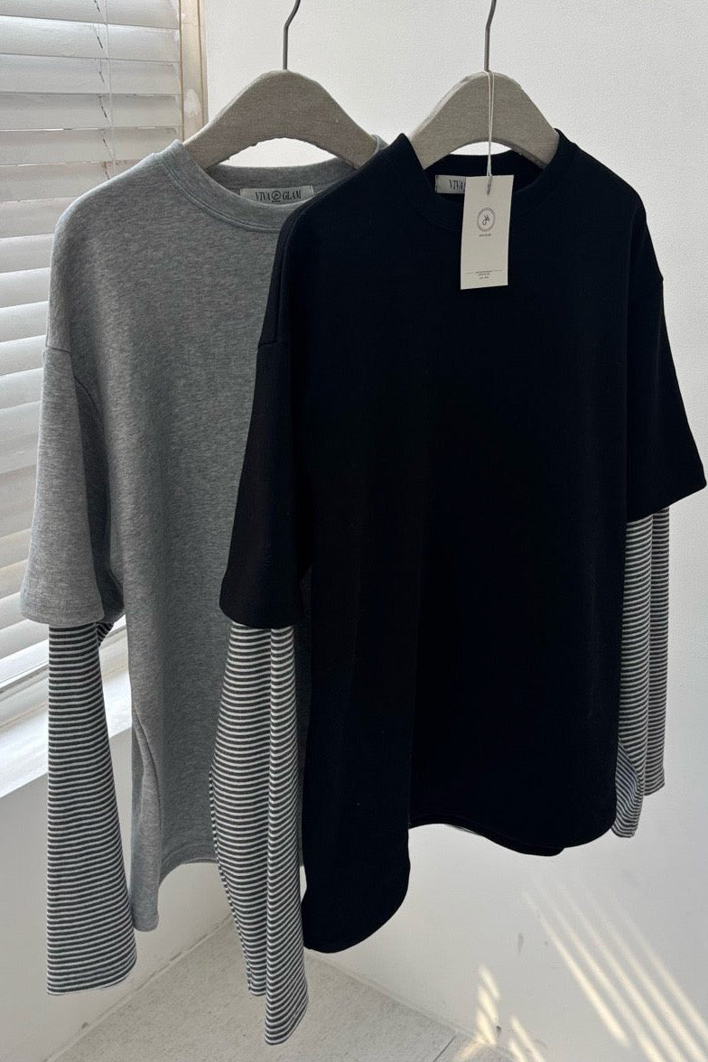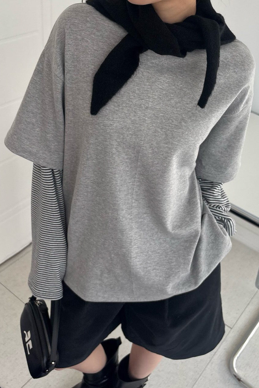 A casual layered tee featuring a short-sleeve top combined with striped long sleeves for an effortless, styled look. Designed in a relaxed boxy fit, it offers comfortable wear and an easy, laid-back silhouette. Perfect for everyday outfits with minimal styling needed.