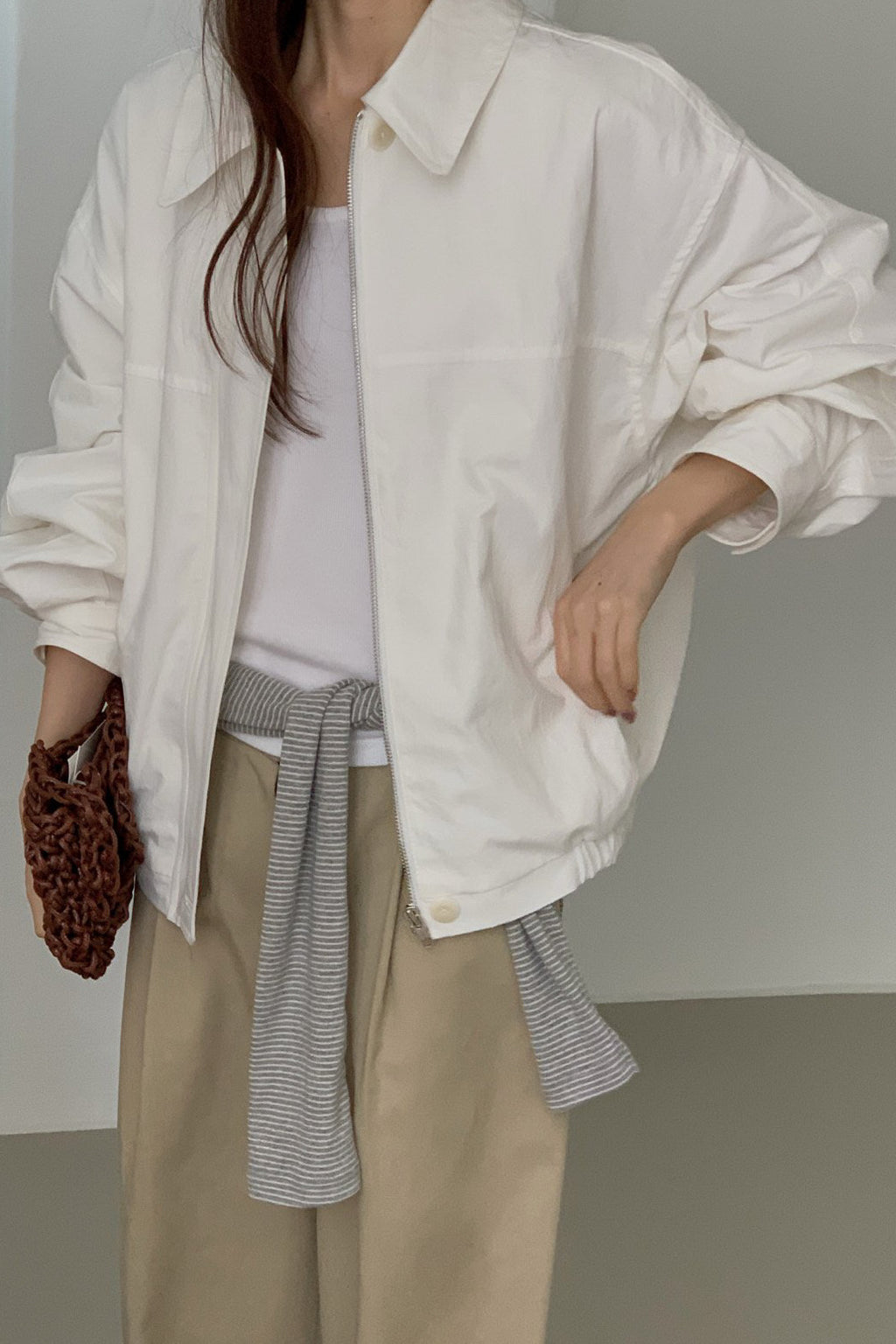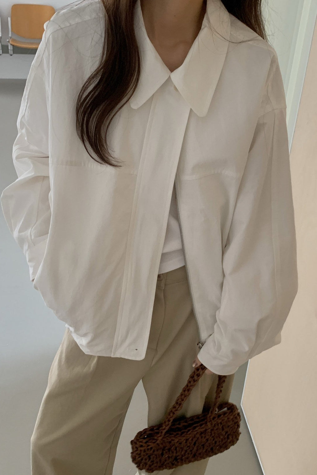 Featuring a classic collar, front zipper closure, and gently voluminous sleeves, it creates a softly rounded shape that feels modern and refined. The slightly cropped length pairs naturally with high-rise trousers or denim, making it an easy everyday outer layer.