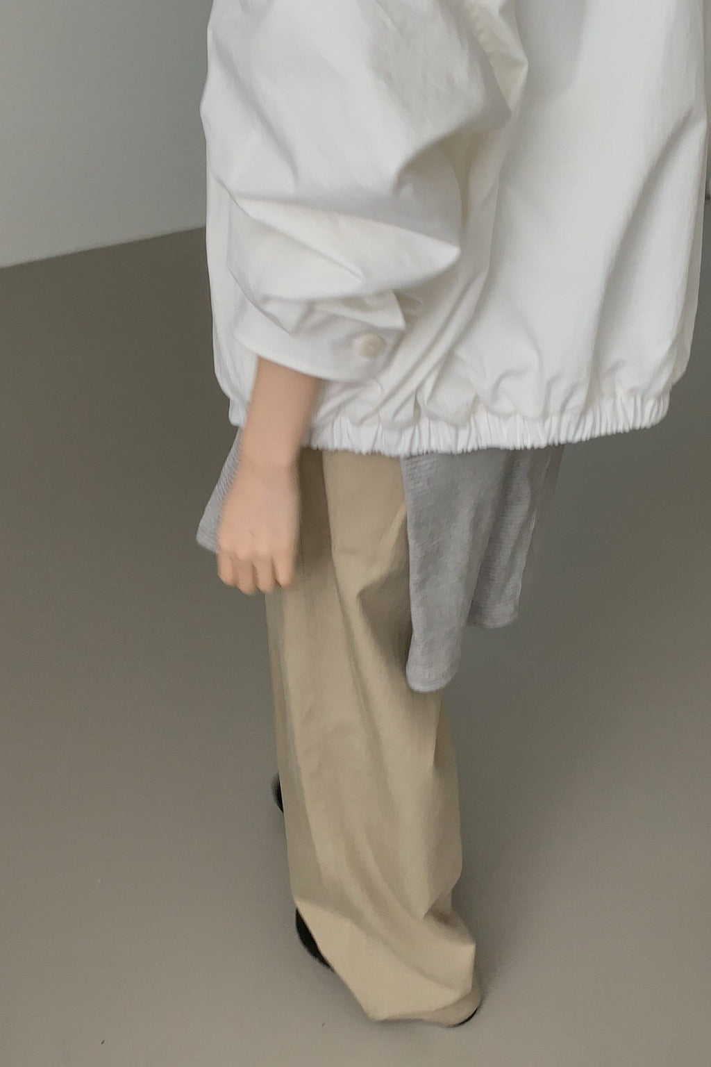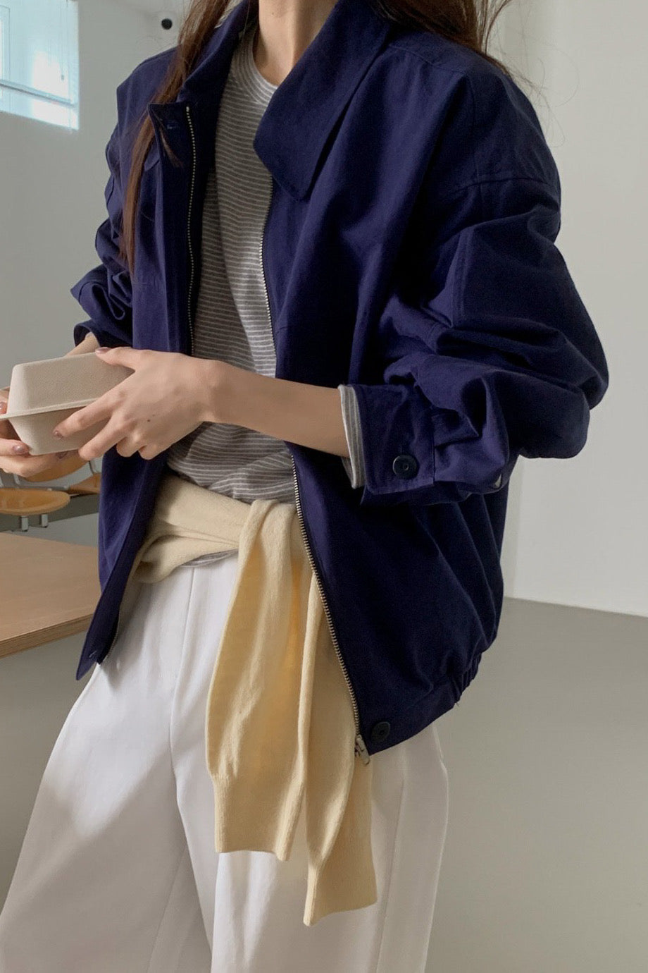 A relaxed-fit blouson jacket designed with a clean, effortless silhouette. The structured yet lightweight fabric holds its shape beautifully, while the smooth lining adds comfort for easy layering.