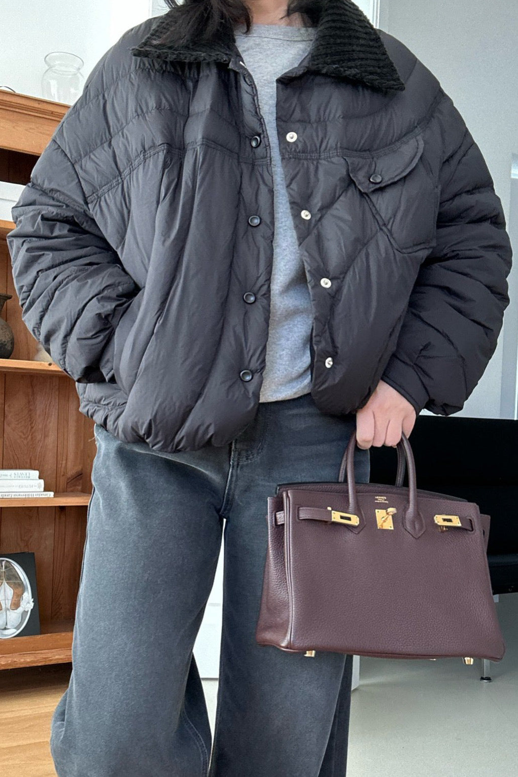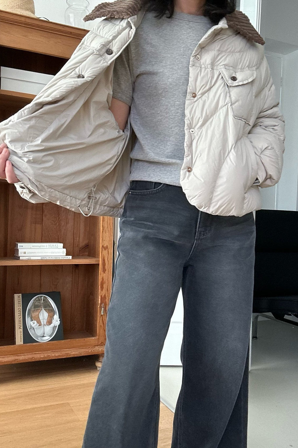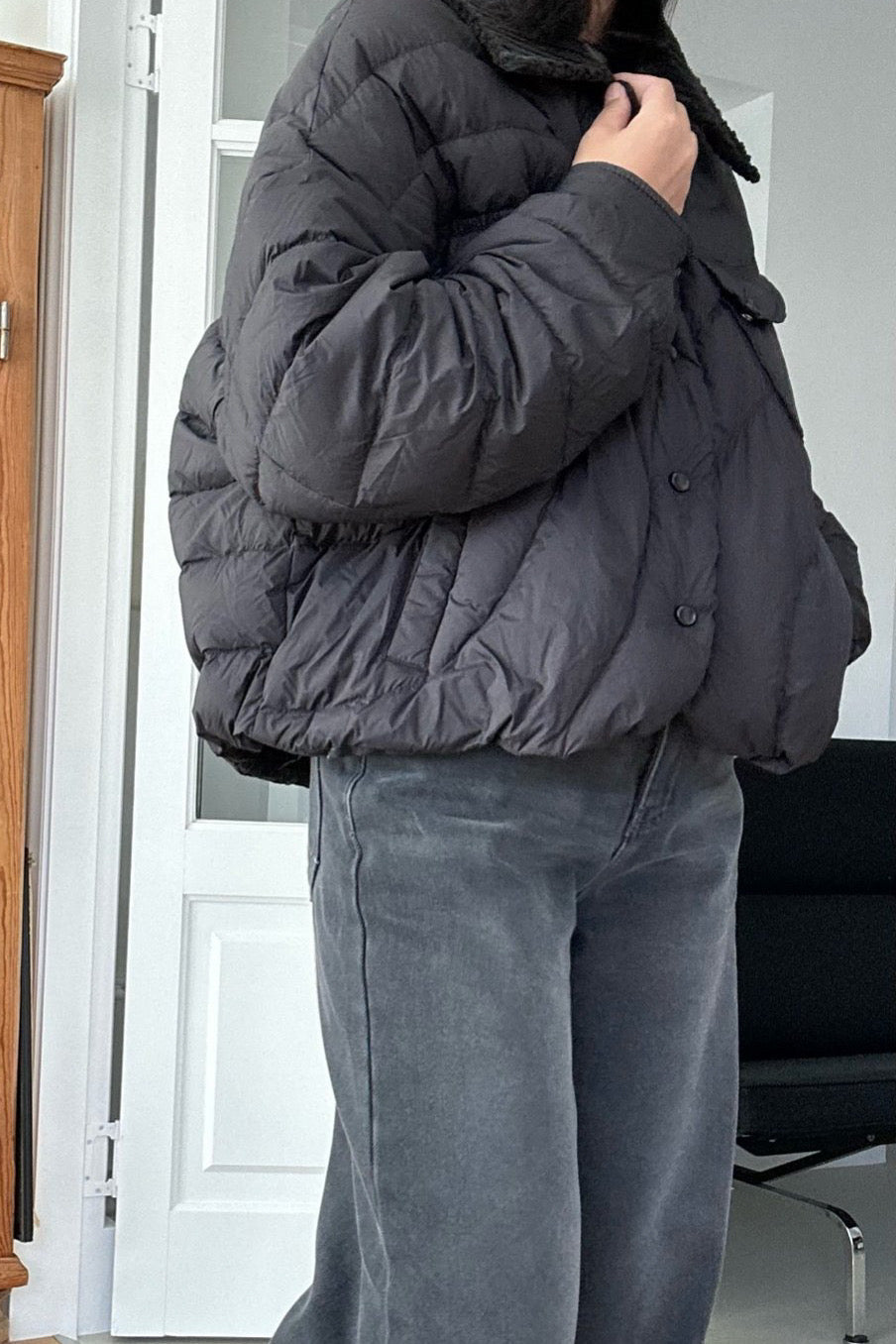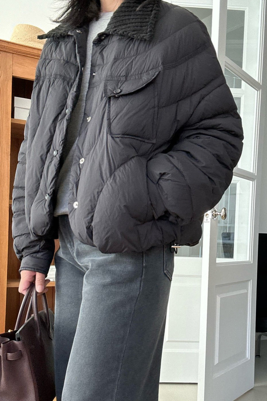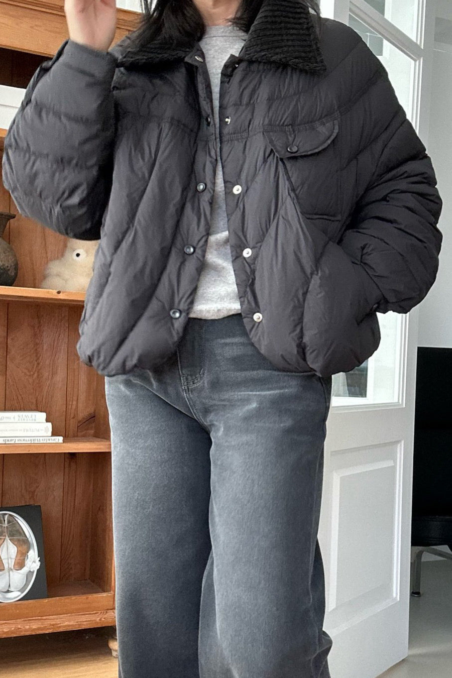 The Featherlight Goose Down Padding is a ultra light yet warm outerwear piece crafted with high-quality goose down filling. Its soft quilting and rounded hemline create a relaxed silhouette, while the corduroy contrast collar adds a refined, cozy touch. Designed for effortless layering, this jacket delivers both warmth and style without the bulk. The neat stitch details and snap-button closure make it an easy, go-to piece for everyday winter wear.