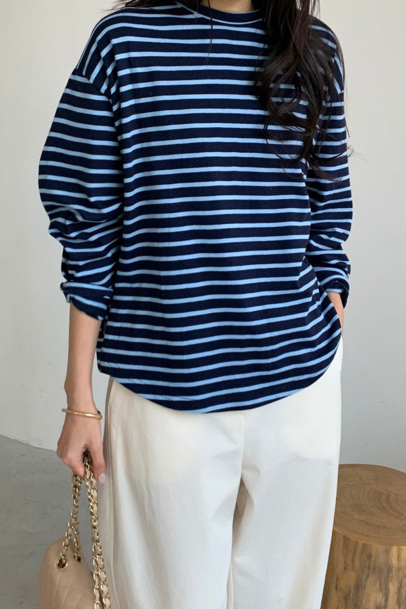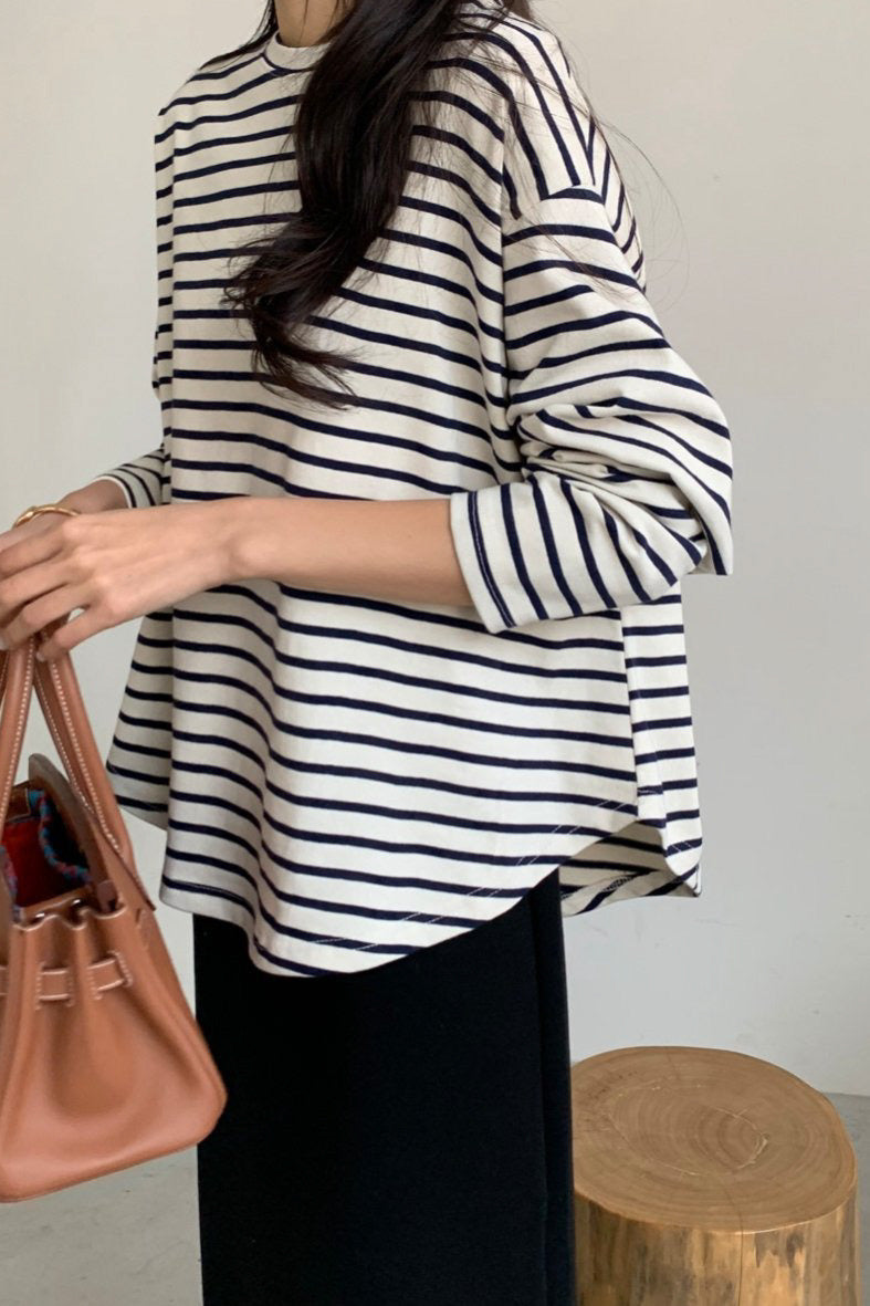 A relaxed batwing silhouette gives this striped tee its effortless charm. The softly draped shape falls naturally from the shoulders, creating a loose yet flattering fit that pairs beautifully with both skirts and pants.
