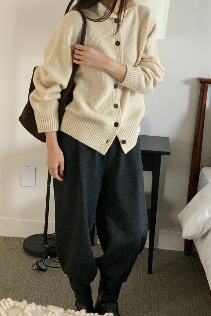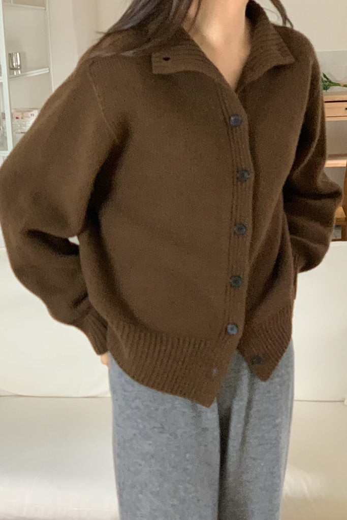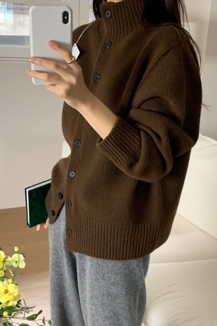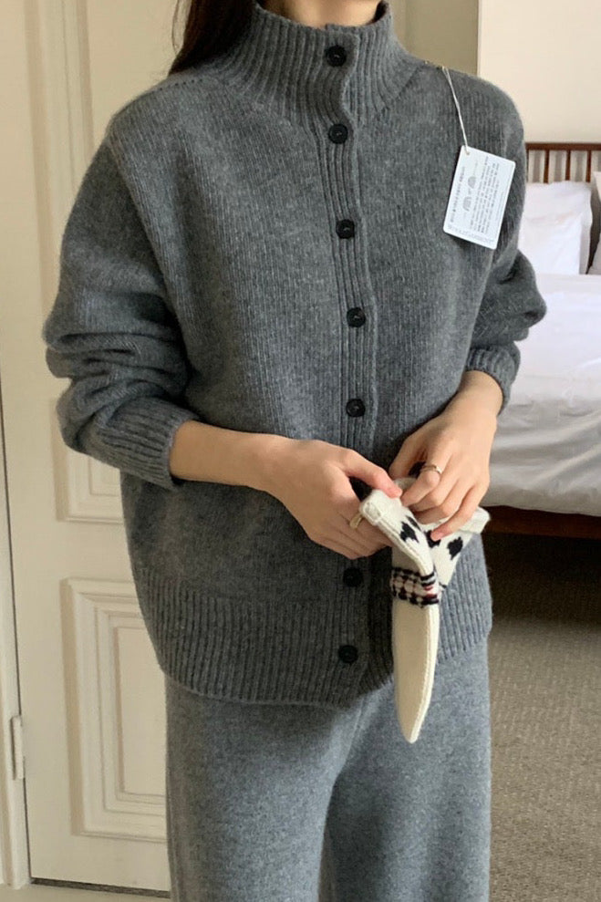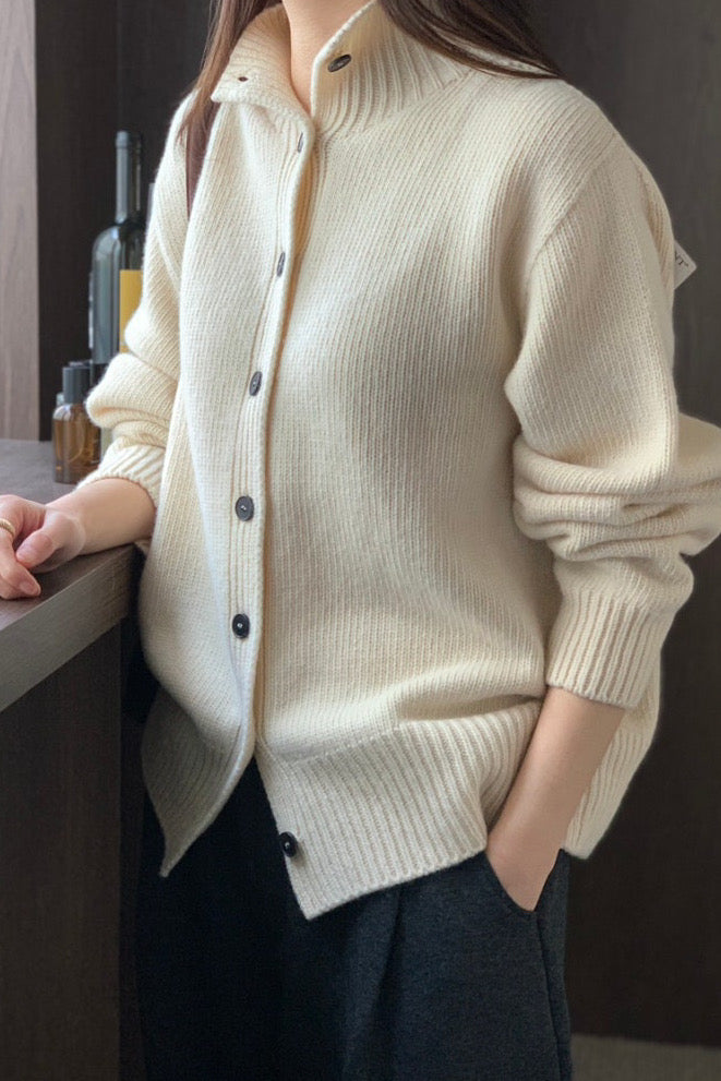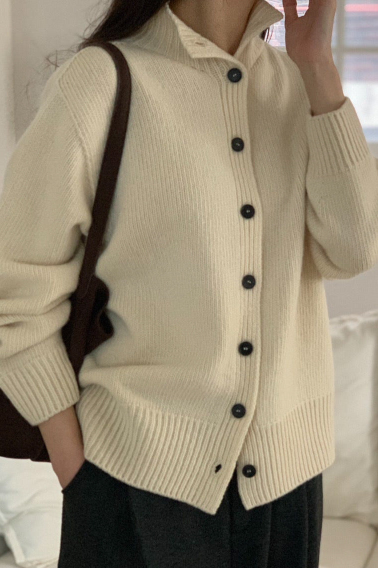 A premium button-up cardigan crafted from high-quality superfine wool for a soft yet structured feel. Designed with a clean, minimal silhouette, it features a ribbed stand neckline, relaxed fit, and classic button closure. The finely knit texture offers warmth without bulk, making it perfect for layering or wearing on its own. A timeless knit cardigan that blends comfort with understated elegance.