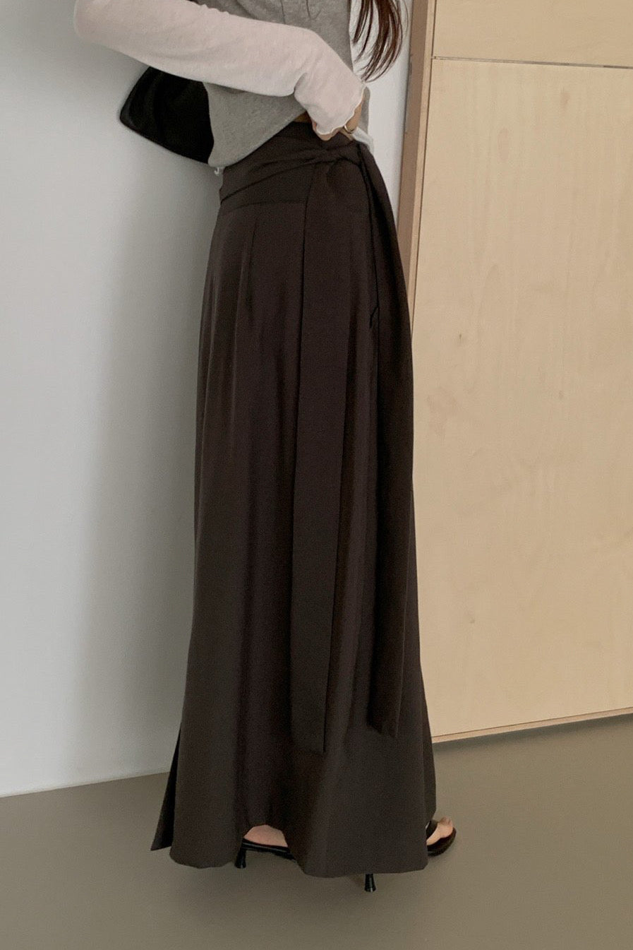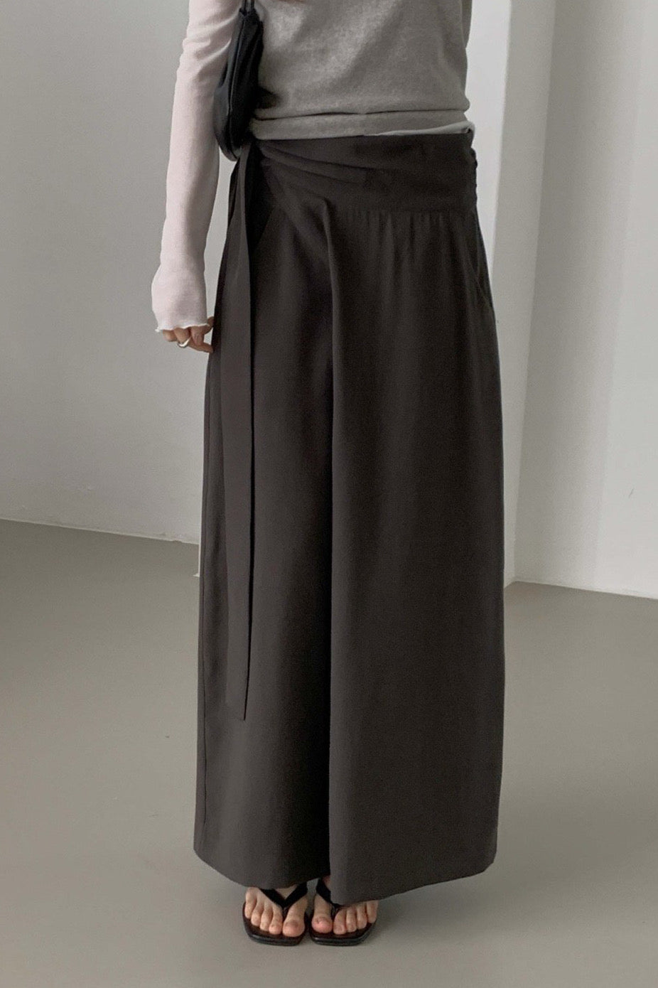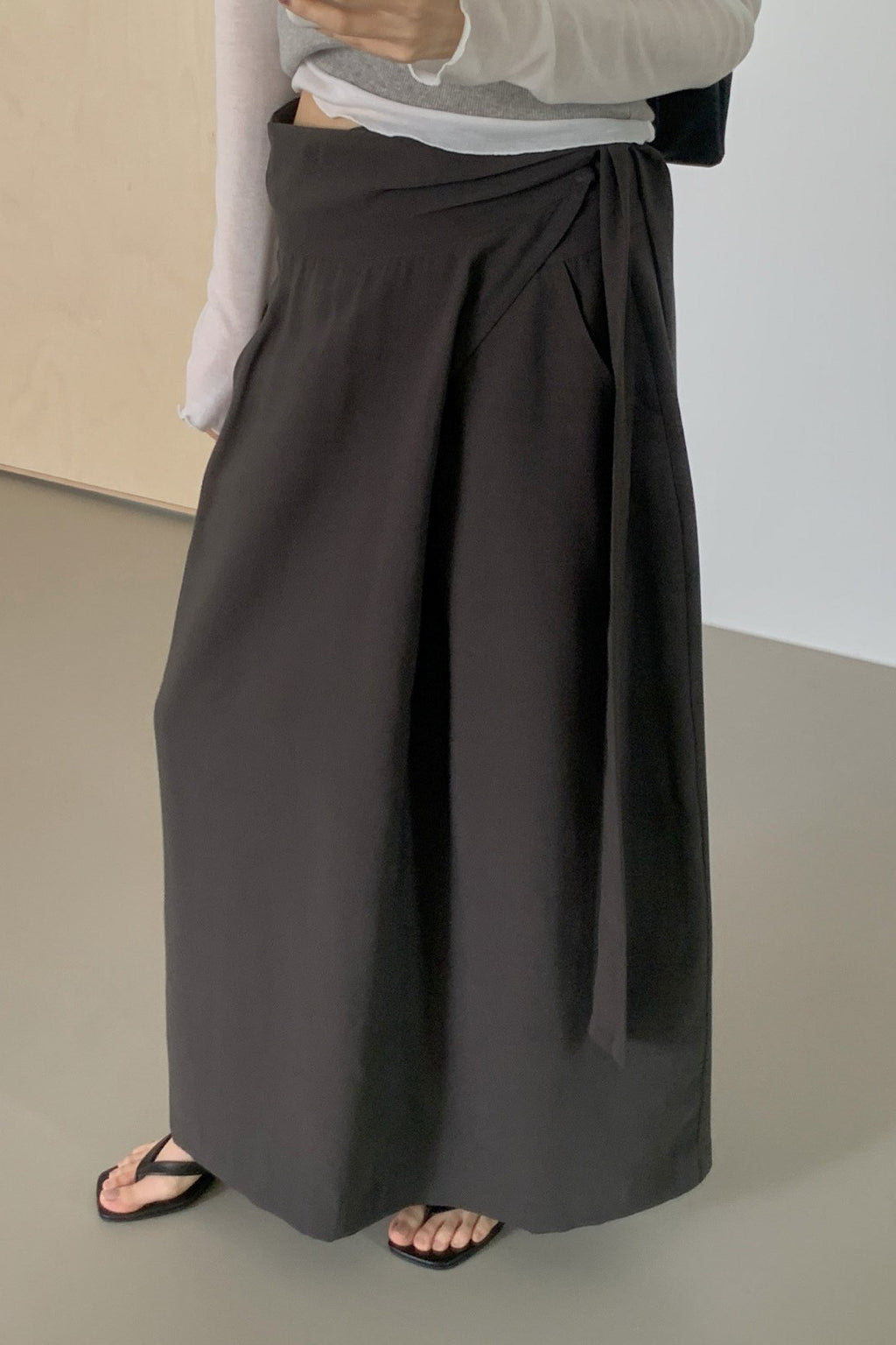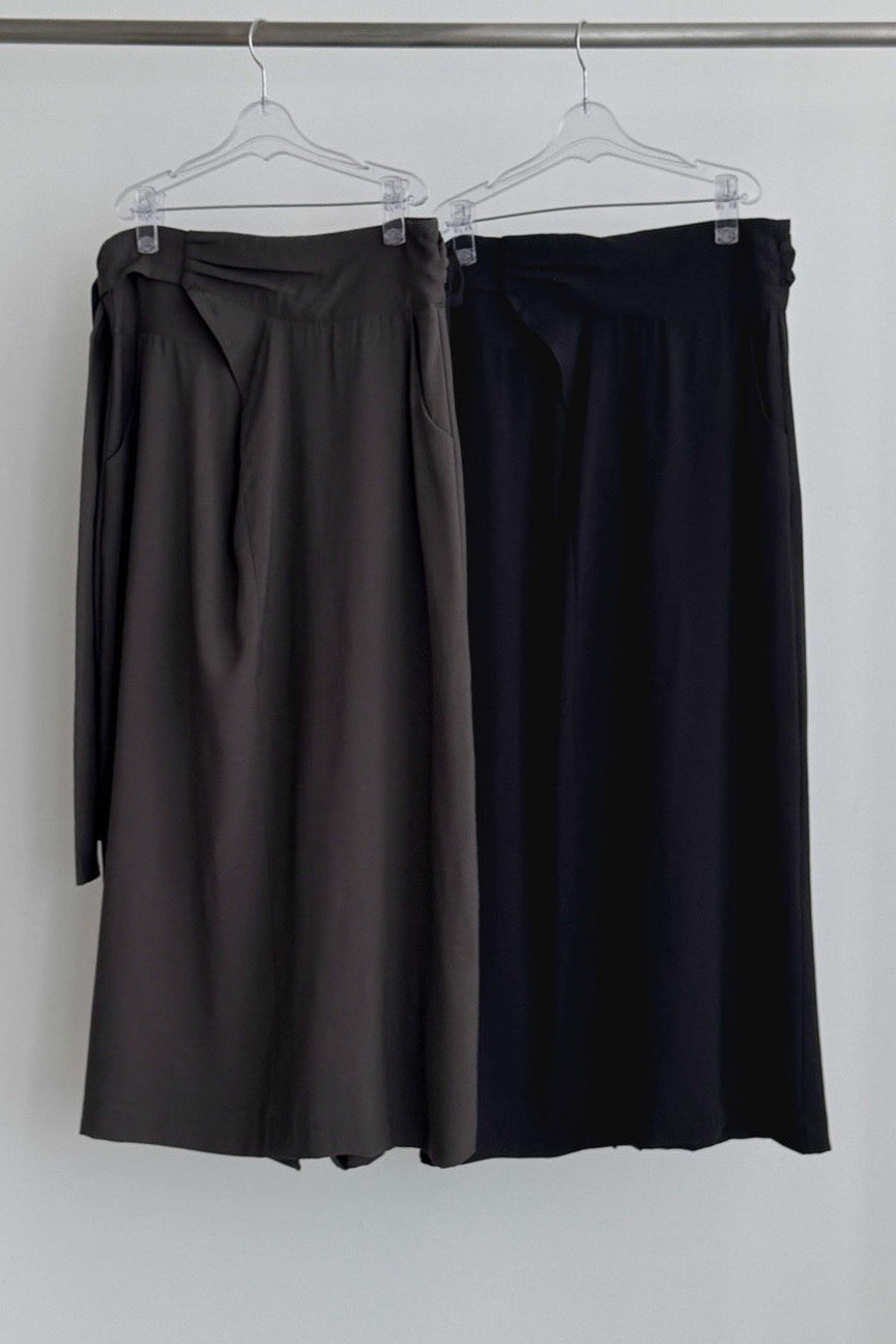 A refined wrap-style skirt designed with a soft diagonal drape that ties naturally at the waist. The clean structure creates a smooth, elongated silhouette while adding subtle movement with every step.