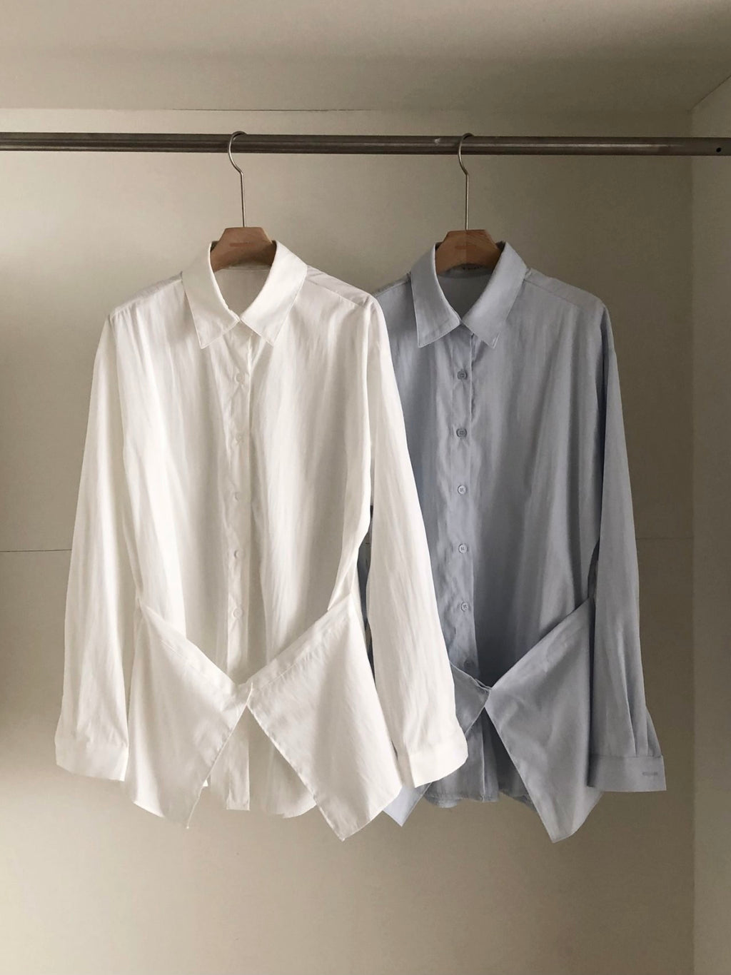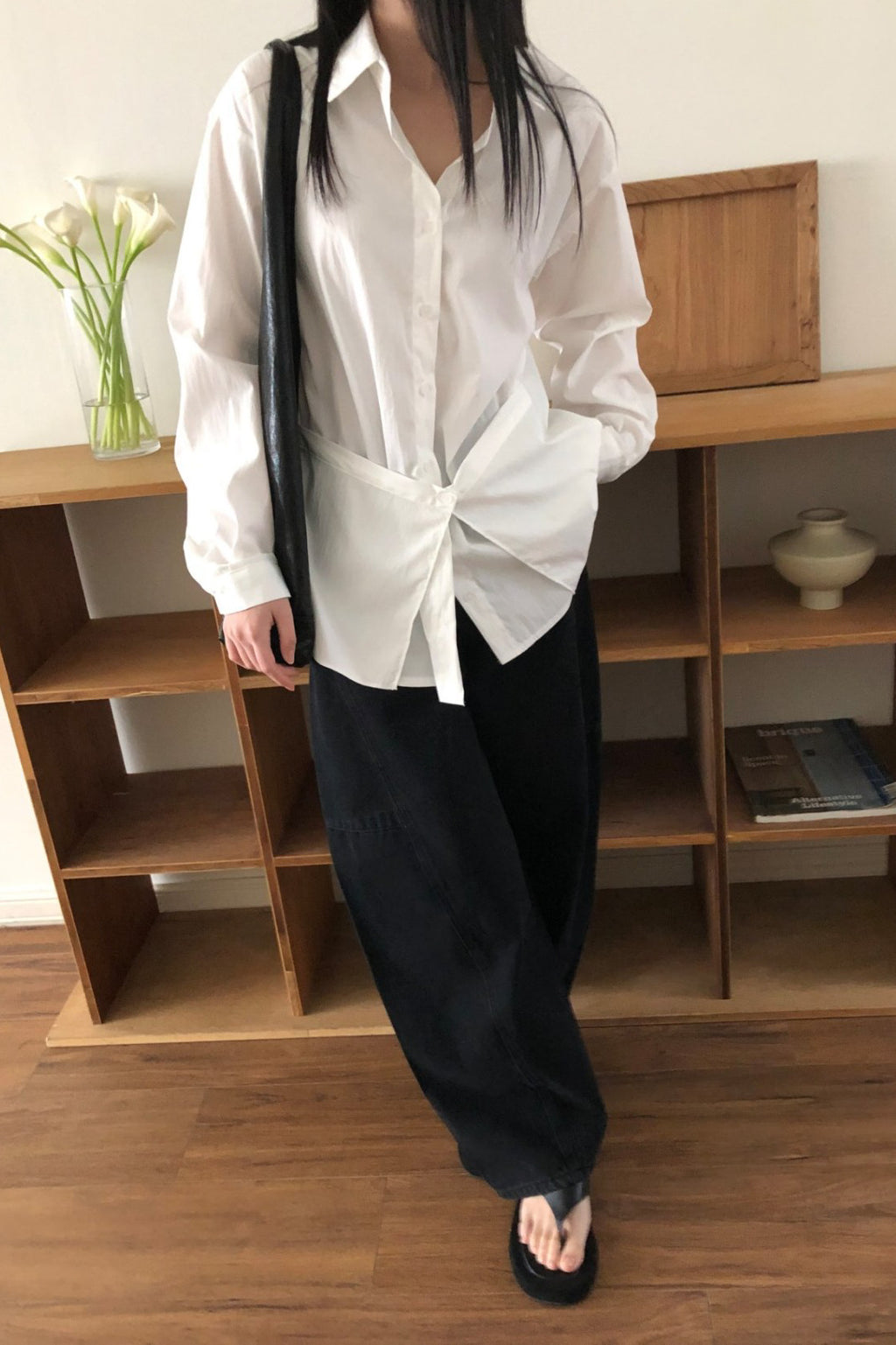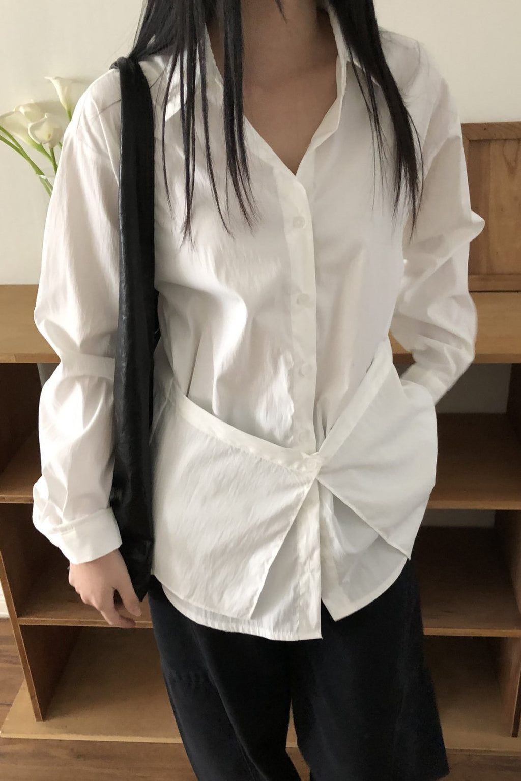 Designed with a distinctive wrap detail, this shirt features a side panel that softly crosses over the front for a naturally layered look. The relaxed fit and lightweight fabric create an easy drape that feels comfortable yet refined. Wear it buttoned for a clean silhouette or style it slightly open for a modern, effortless mood. A subtle statement piece that elevates simple outfits with minimal effort, available in crisp white and soft light blue.