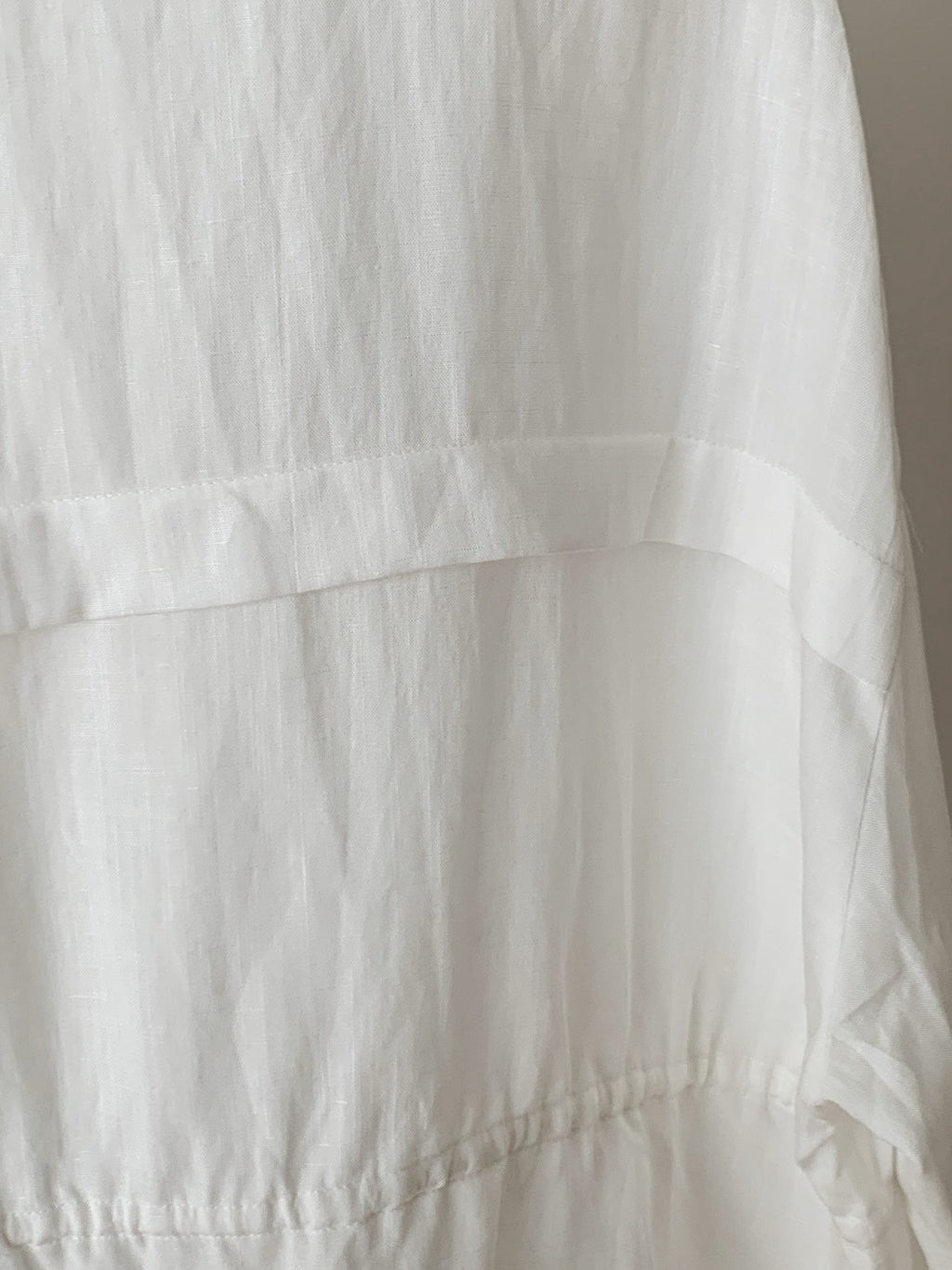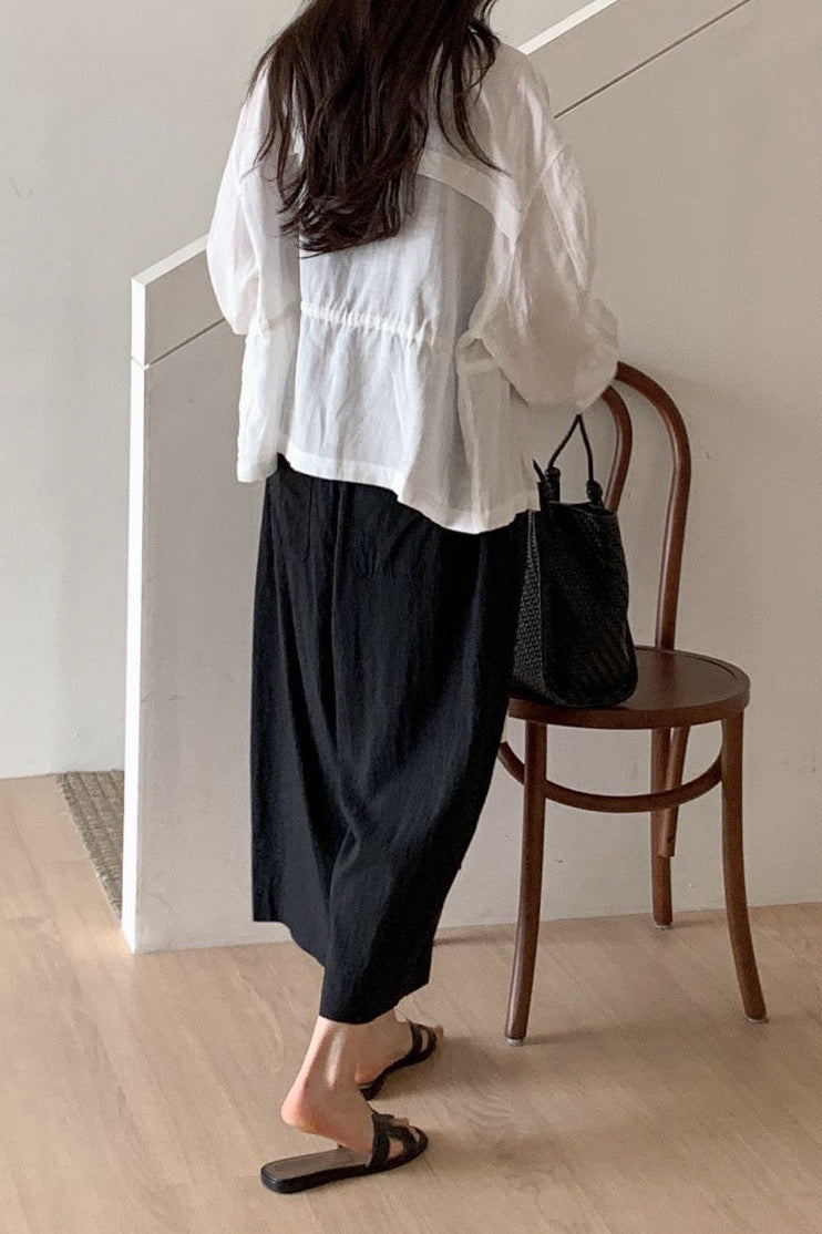 Equipped with an internal waist drawstring, this jacket allows you to transform the fit from a relaxed, boxy overshirt to a cinched, feminine silhouette with soft shirring. Its lightweight, breathable construction makes it exceptionally versatile—wear it open as a light outer layer or buttoned up as a structured blouse. Whether styled with wide-leg trousers for a tonal ensemble or draped over a simple camisole, its sensible design ensures a polished urban attitude.