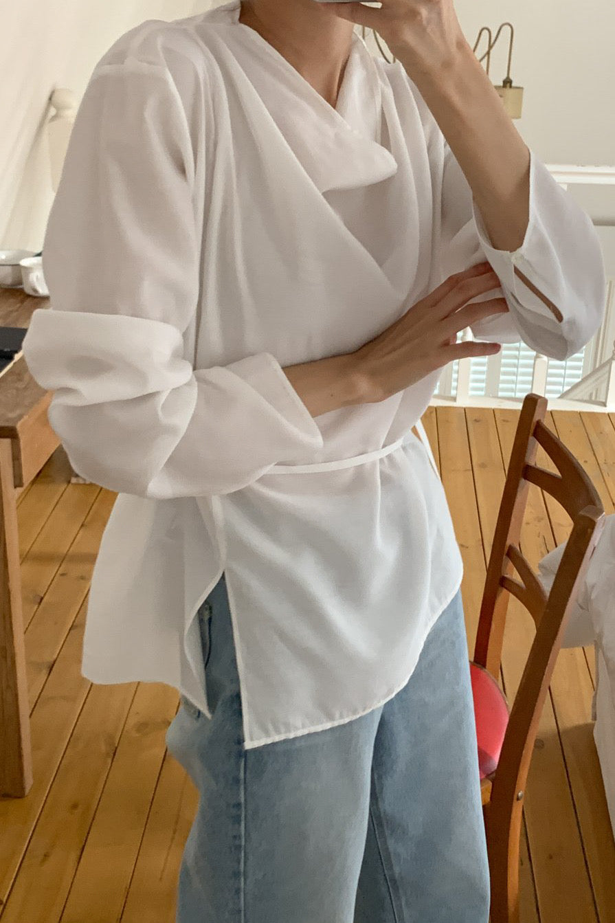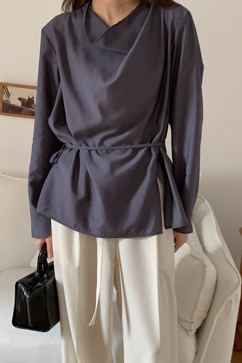 An elegant blouse designed with a soft cowl neck that drapes beautifully along the neckline. The fluid fabric creates a graceful silhouette, while the slim waist tie adds subtle definition for a refined shape. Light and airy with a relaxed fit, it transitions effortlessly from casual denim to tailored trousers for a polished, feminine look.