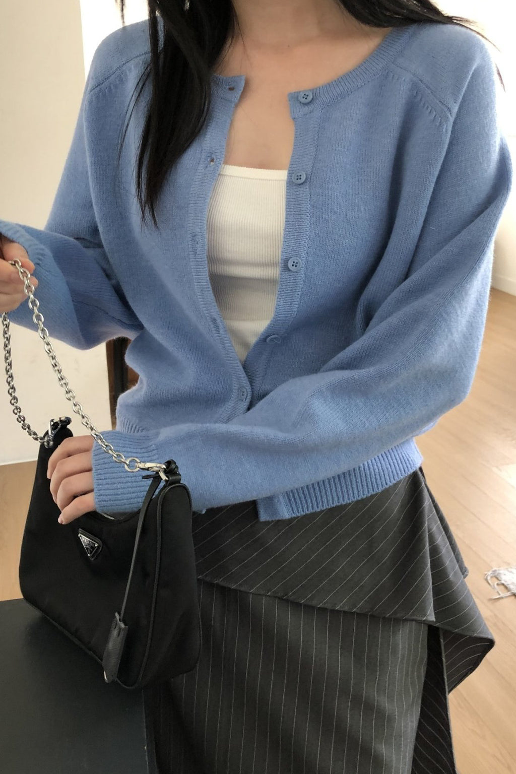 The smooth knit texture feels gentle against the skin, while the neatly finished ribbed cuffs and hem add subtle structure. Perfect for layering over tanks or tees, it’s a versatile piece that pairs effortlessly with skirts, trousers, or denim for a polished yet relaxed look.