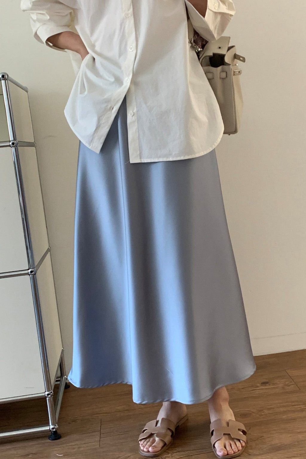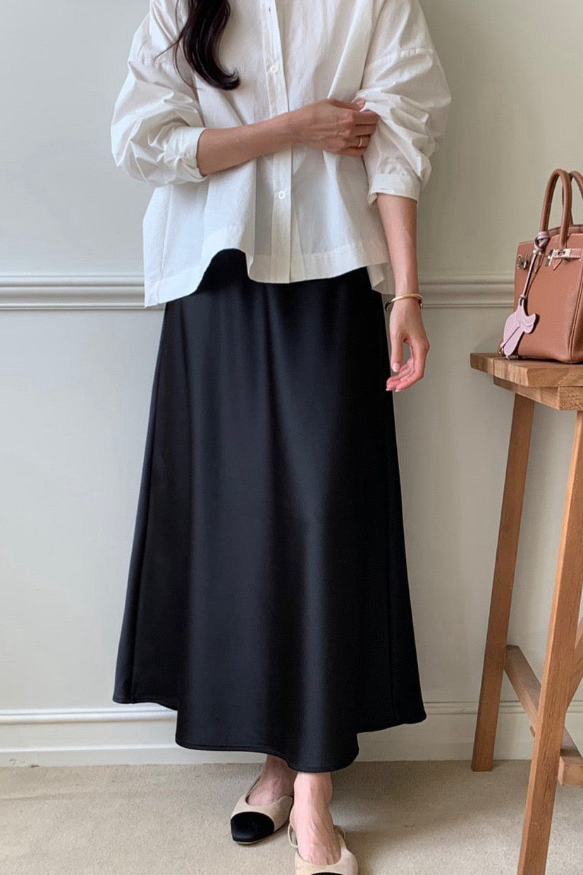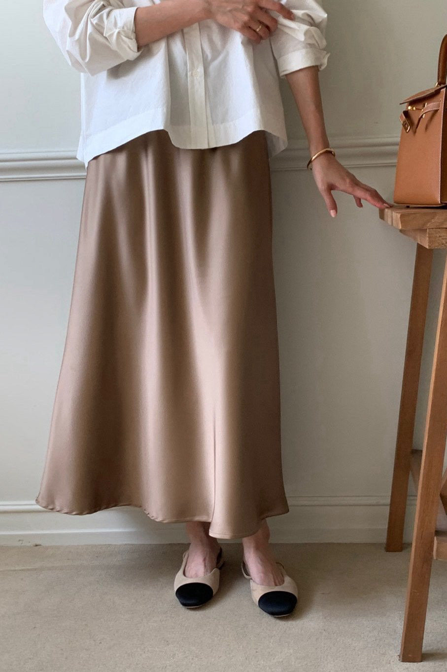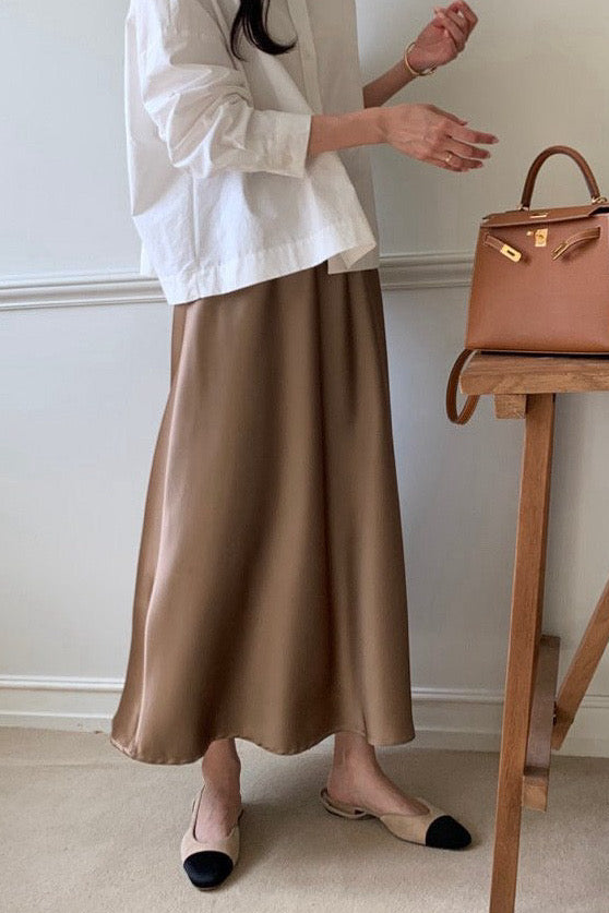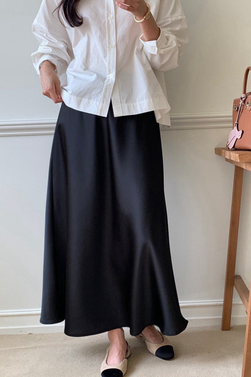 A beautifully flowing satin skirt designed with a soft flare silhouette that moves gracefully with every step. The smooth satin fabric gives it a subtle sheen, adding an elegant touch while remaining easy to style for everyday wear.