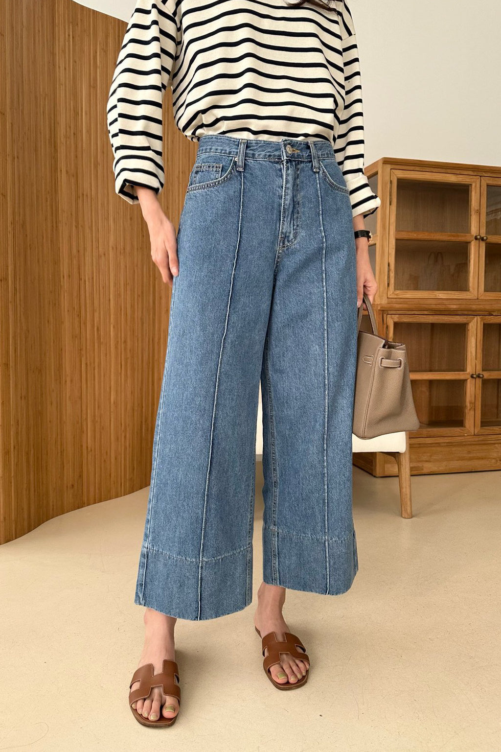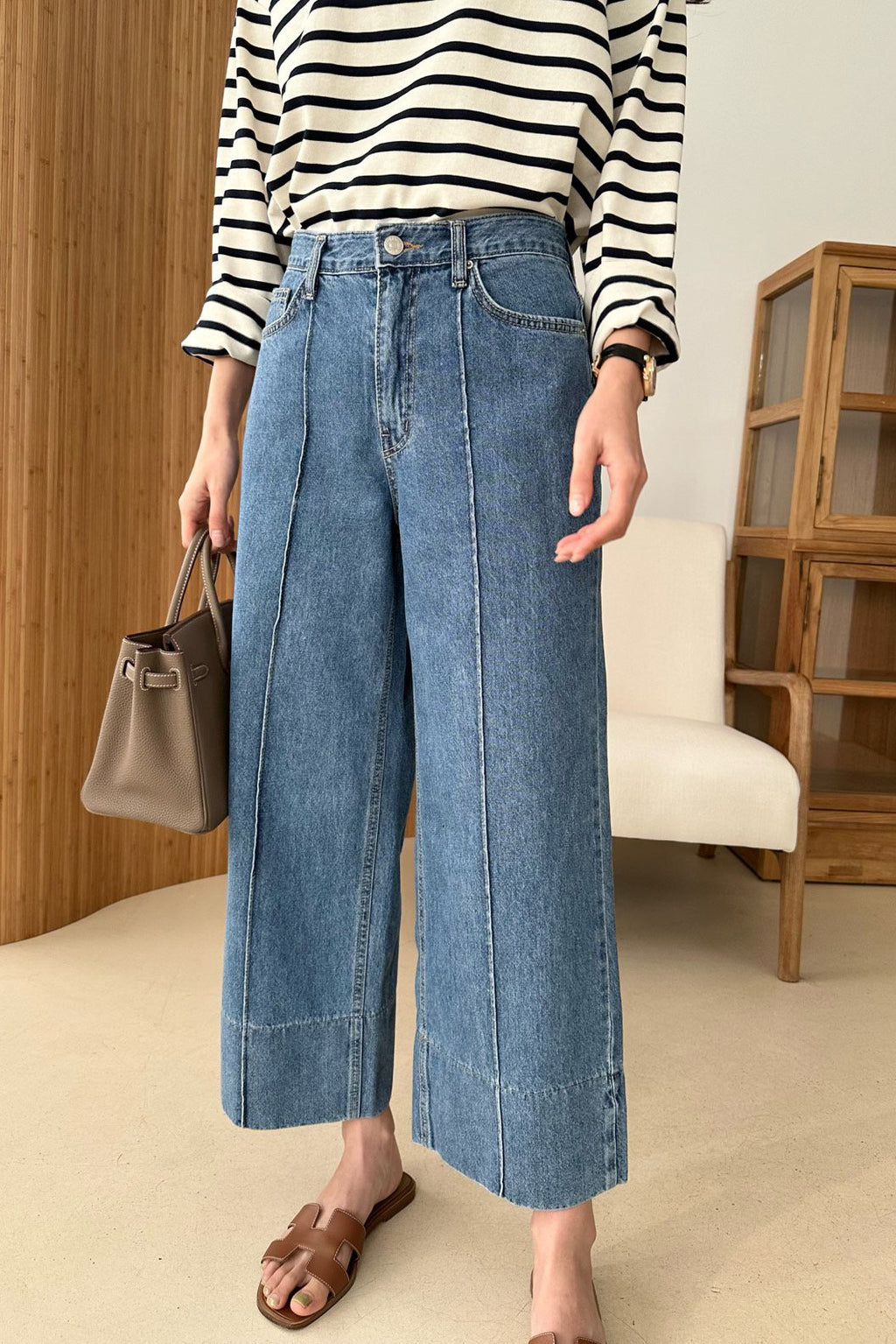Designed with bold stitching along the wide hems and pressed center seams, these jeans create a beautifully structured, elongated silhouette. The added seam detail enhances the leg line, giving the fit a clean, tailored feel while maintaining a relaxed wide shape.