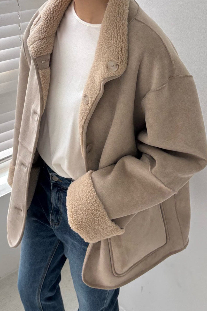 The Reversible Teddy Mustang Jacket offers two cozy looks in one, featuring a plush teddy fleece on one side and a smooth suede finish on the other. With its relaxed, slightly oversized silhouette and stand collar design, it delivers both warmth and a refined casual style. The jacket’s button closure and large pockets add practicality, while its soft texture ensures comfort throughout the colder seasons.