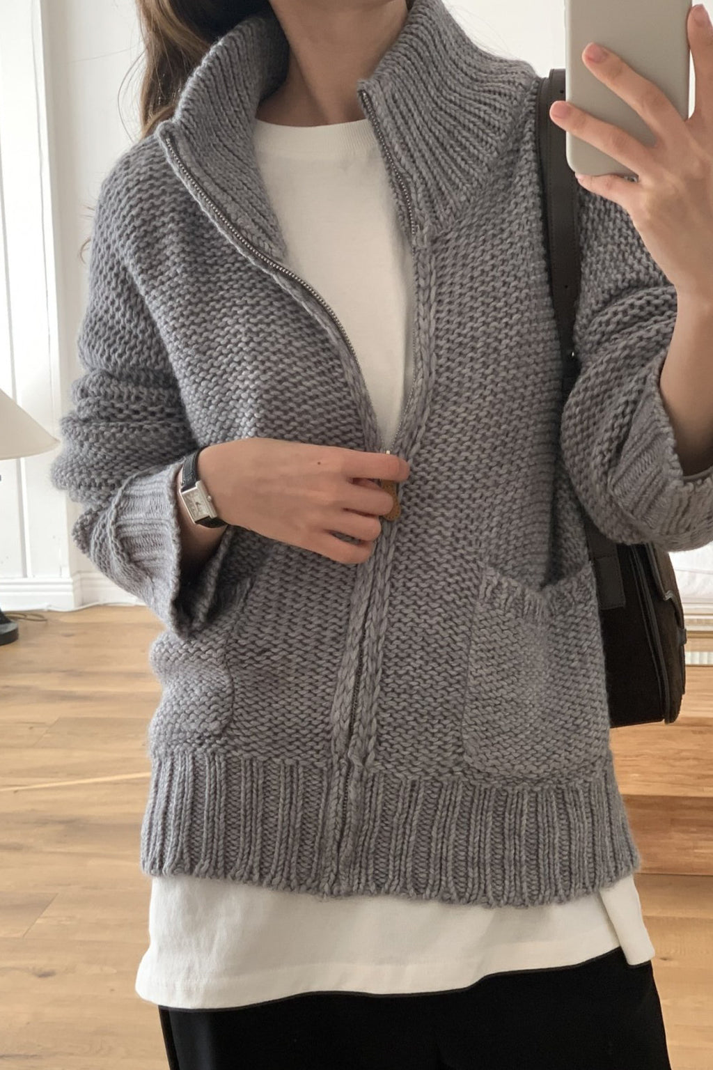 The Tod Wool Zip-up is a chunky knit cardigan with a high funnel neck and sturdy zip closure, blending warmth and structure for cozy layering. Made with a thick wool blend, its textured garter stitch, ribbed hem, and roomy front pockets give it a laid-back yet substantial feel. Wear it zipped up for a snug, sculpted look or open over basics for effortless casual styling. Available in oatmeal and heather gray.