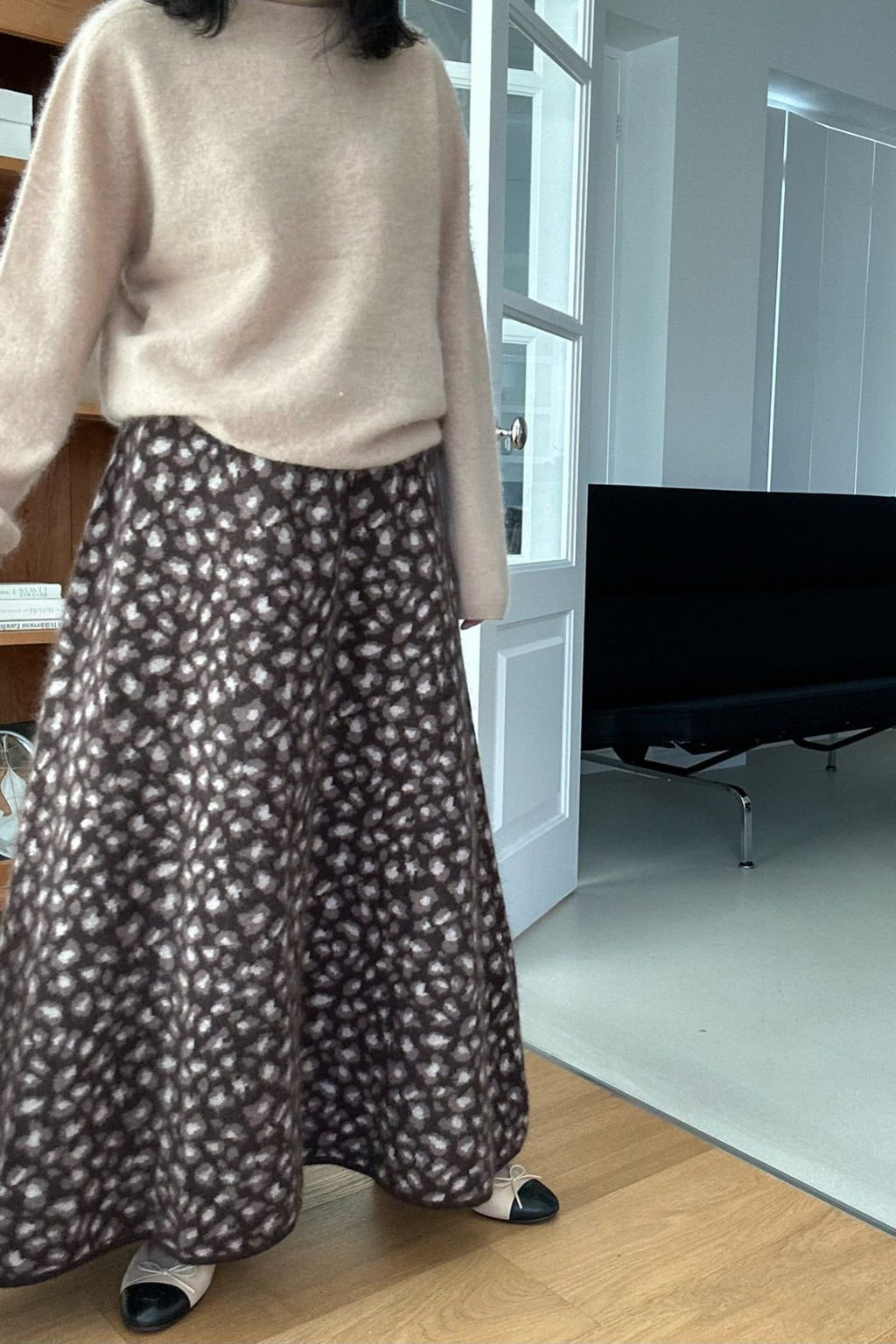 The Soft Leopard Wool Skirt is a refined take on the classic animal print, crafted from a luxuriously soft and dense double-knit wool blend. With its substantial weight and full A-line silhouette, it drapes beautifully while providing exceptional warmth and structure.