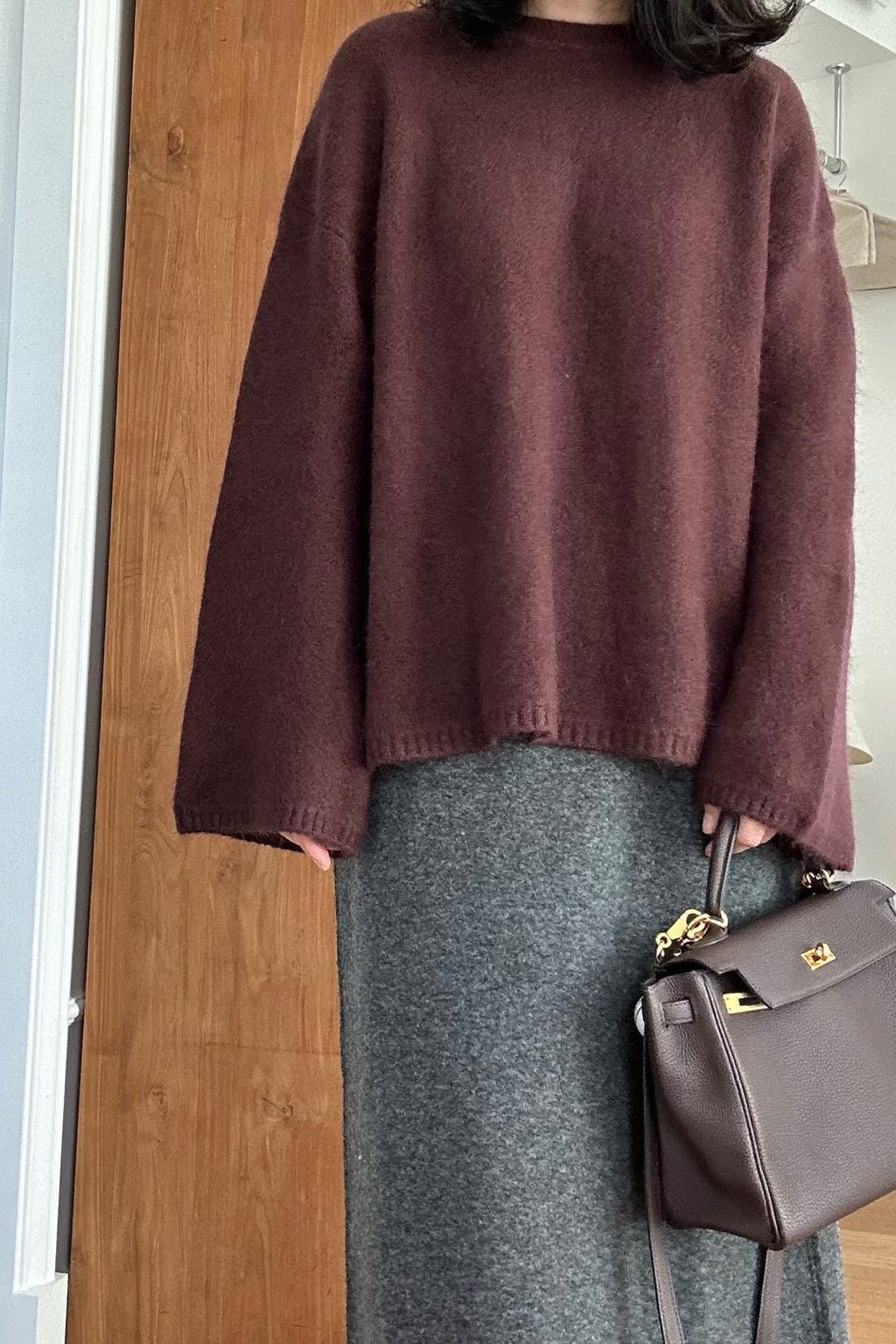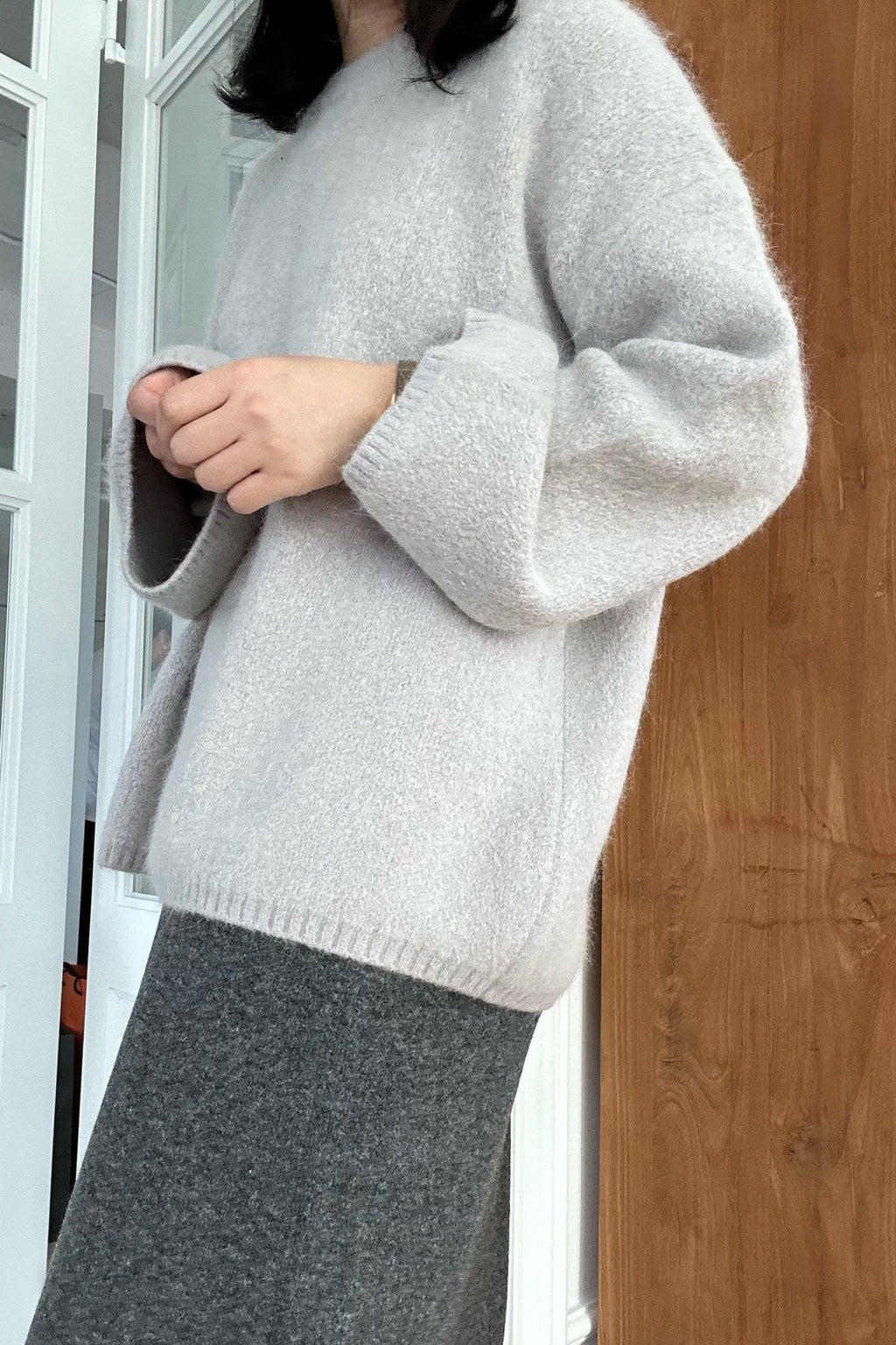 The Flare Sleeve Wool Sweater is a beautifully relaxed knit crafted from a soft, hairy double-knit wool blend. Its defining feature is the gently flared sleeves that drape with effortless elegance, adding subtle movement to the silhouette. The loose fit offers both comfort and style, making it perfect as a cozy cover-up or a statement knit on its own.